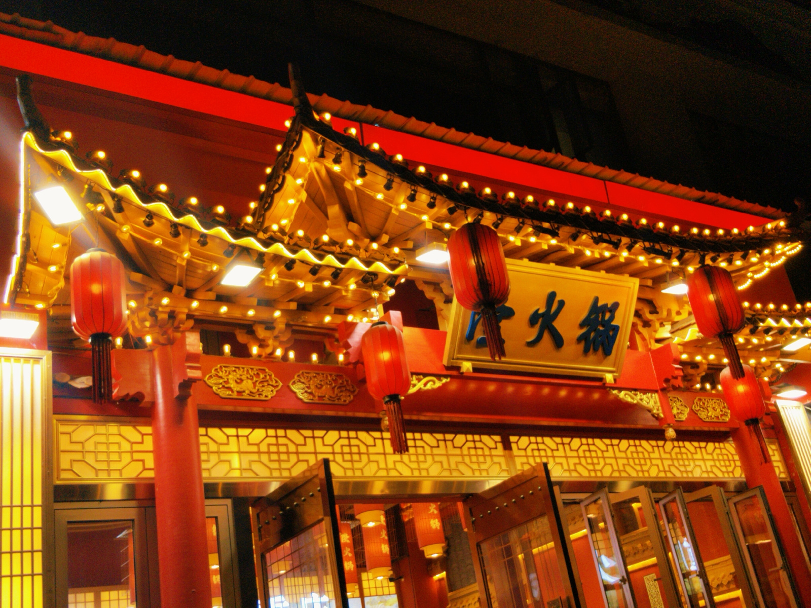 Captured at night in Yuzhong District, China, the image showcases an illuminated Chinese restaurant. The architecture features a red roof, ornate gold trim, and traditional Chinese lanterns. Strings o…read more