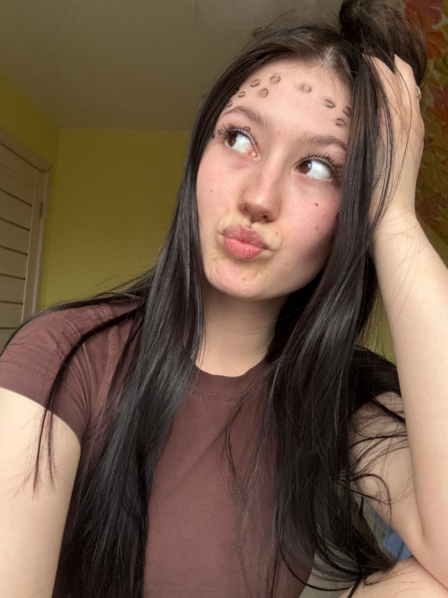 The image captures a close-up, tilted portrait of a young woman with long, dark, straight hair, looking upwards and to her left with a playful, slightly pouting expression. She is wearing a brown t-sh…read more