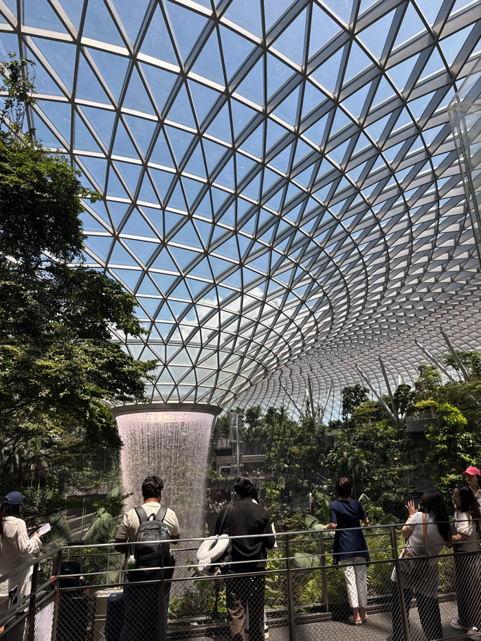 The image captures an indoor scene at Jewel Changi Airport in Singapore, specifically featuring the HSBC Rain Vortex and the Shiseido Forest Valley. A prominent, high glass-and-steel geodesic dome-likβ¦read more