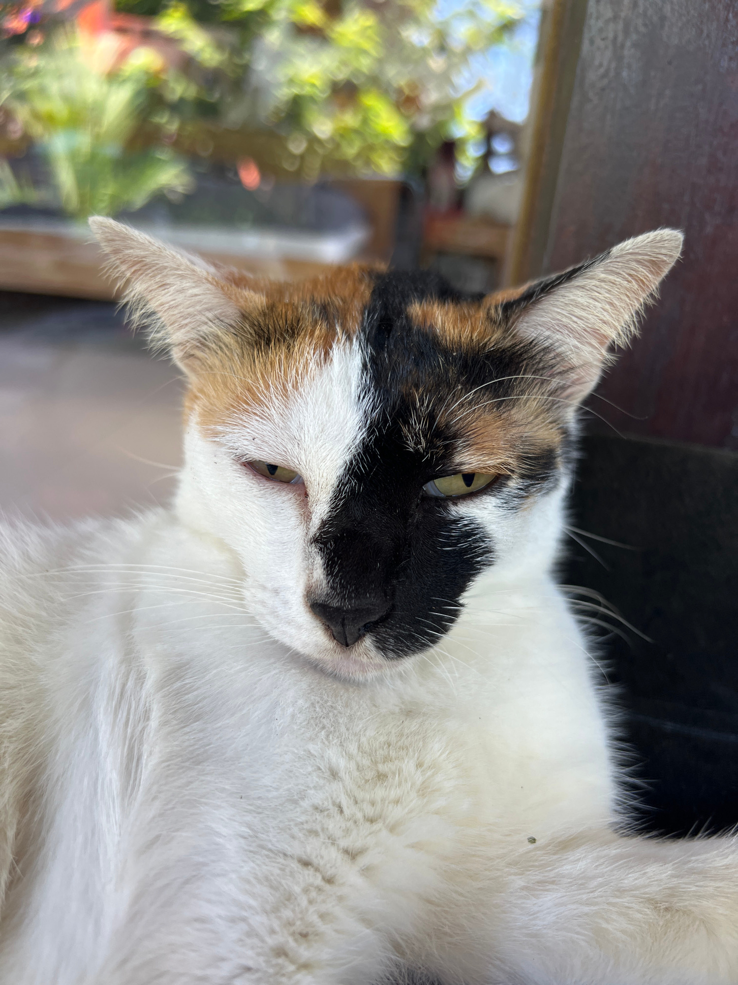 The image is a close-up of a calico cat lying down, seemingly indoors near a window. The cat is predominantly white with patches of black and orange/brown on its head. It has green eyes and a black no…read more