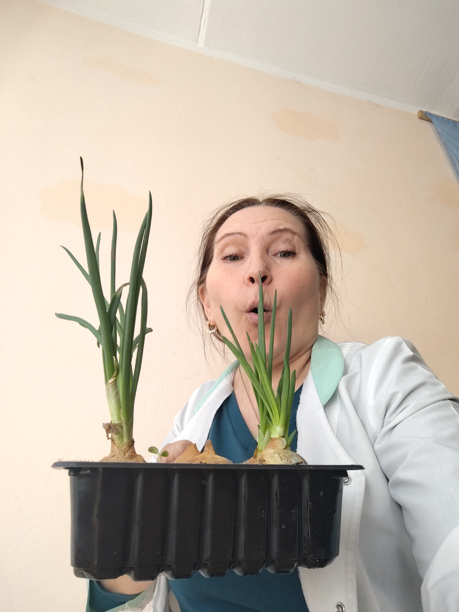 A medium, close-up shot captures a woman holding a black seedling tray with two clumps of sprouted onions, each sprouting in its own compartment. The woman has medium-length brown hair pulled back, li…read more