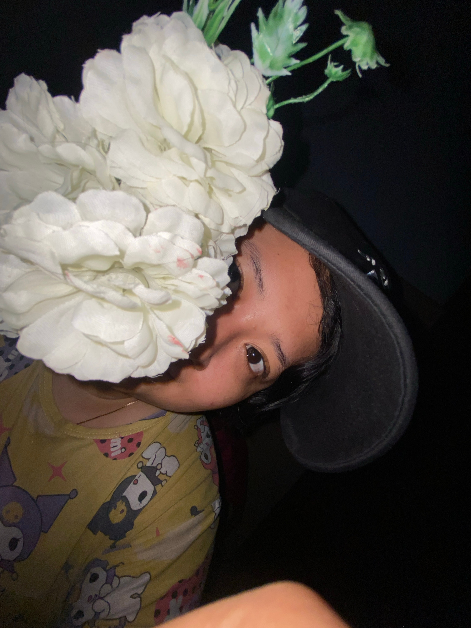 A person wearing a black baseball cap and a yellow shirt with cartoon characters is holding a bouquet of large, white flowers. The person's face is partially obscured by the flowers, with only one eye…read more