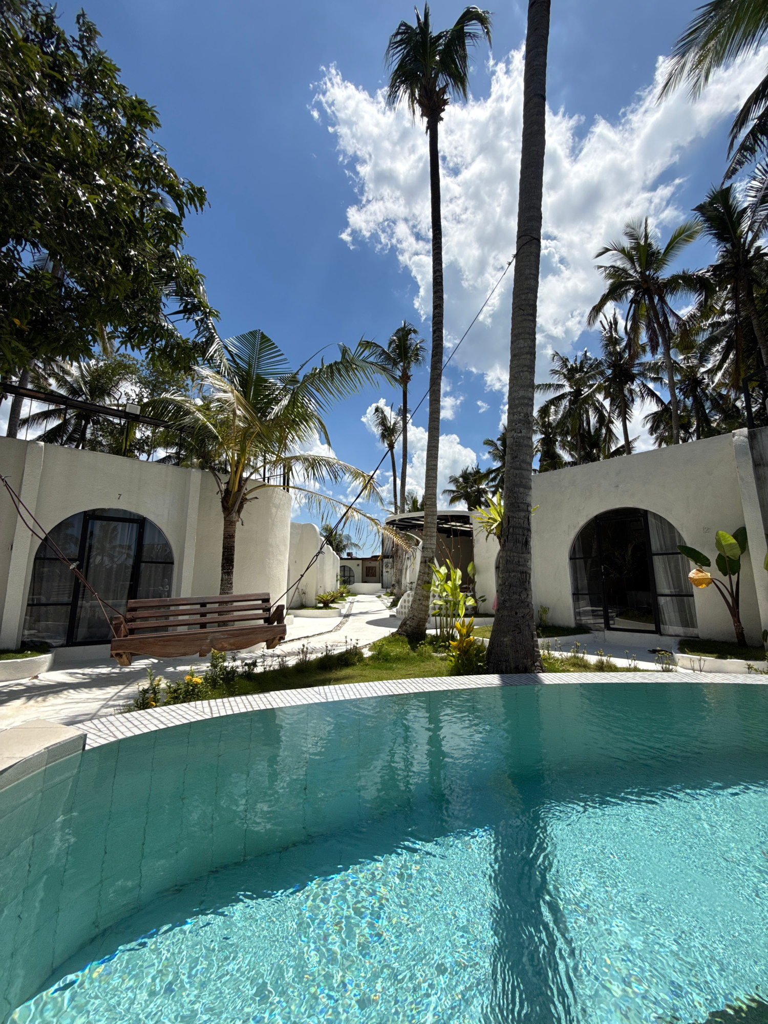 The image captures a tropical scene in Gubug, Indonesia, featuring a swimming pool adjacent to a white, modern building with distinctive arched windows. Palm trees are interspersed throughout the fram…read more