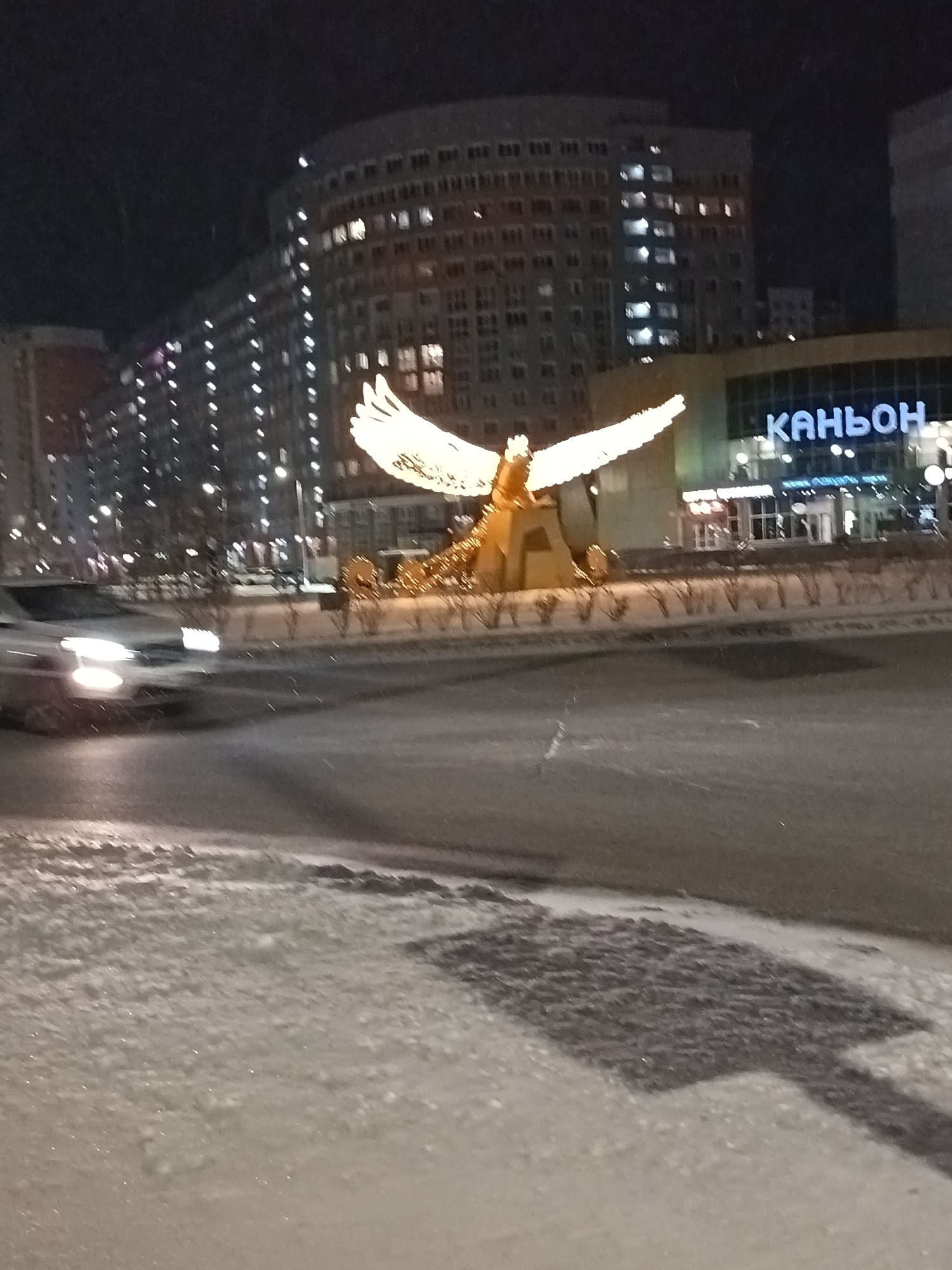 At night in Nizhnevartovsk, Russia, a lighted statue of an eagle with spread wings stands on a traffic island. In the background are multi-story buildings with lit windows and a building with the illu…read more