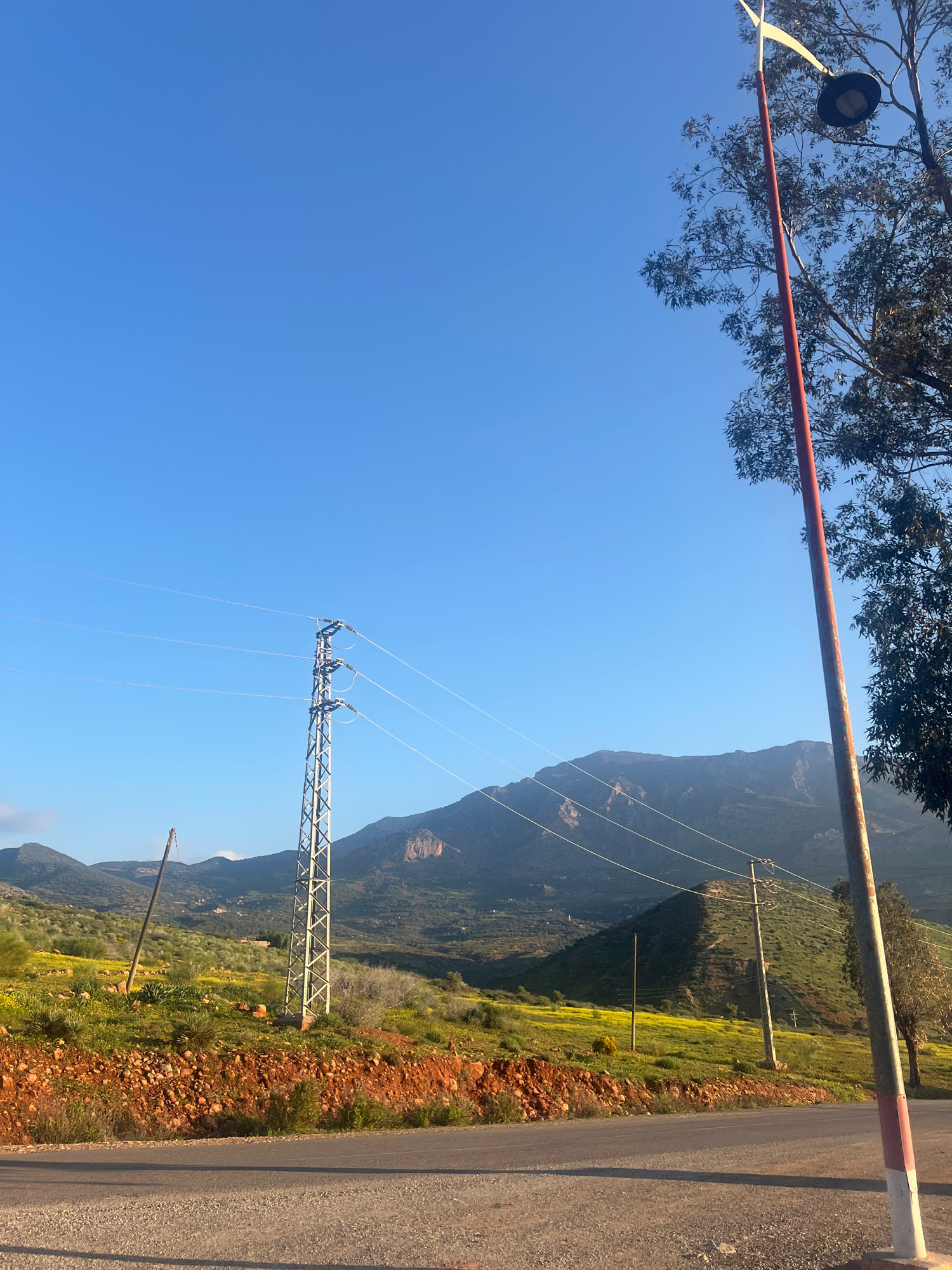 The image depicts a rural roadside scene near Ouaouizert, Morocco, on a sunny day. The ground is a mix of reddish soil and green vegetation. A metal electricity pylon stands prominently, carrying powe…read more