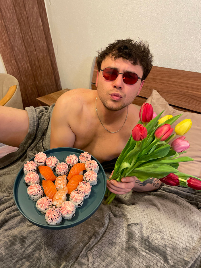 A shirtless man with red sunglasses reclines on a bed, holding a bouquet of tulips. He wears a silver chain and has a tattoo on his left arm. Next to him is a plate filled with sushi rolls and salmon…read more