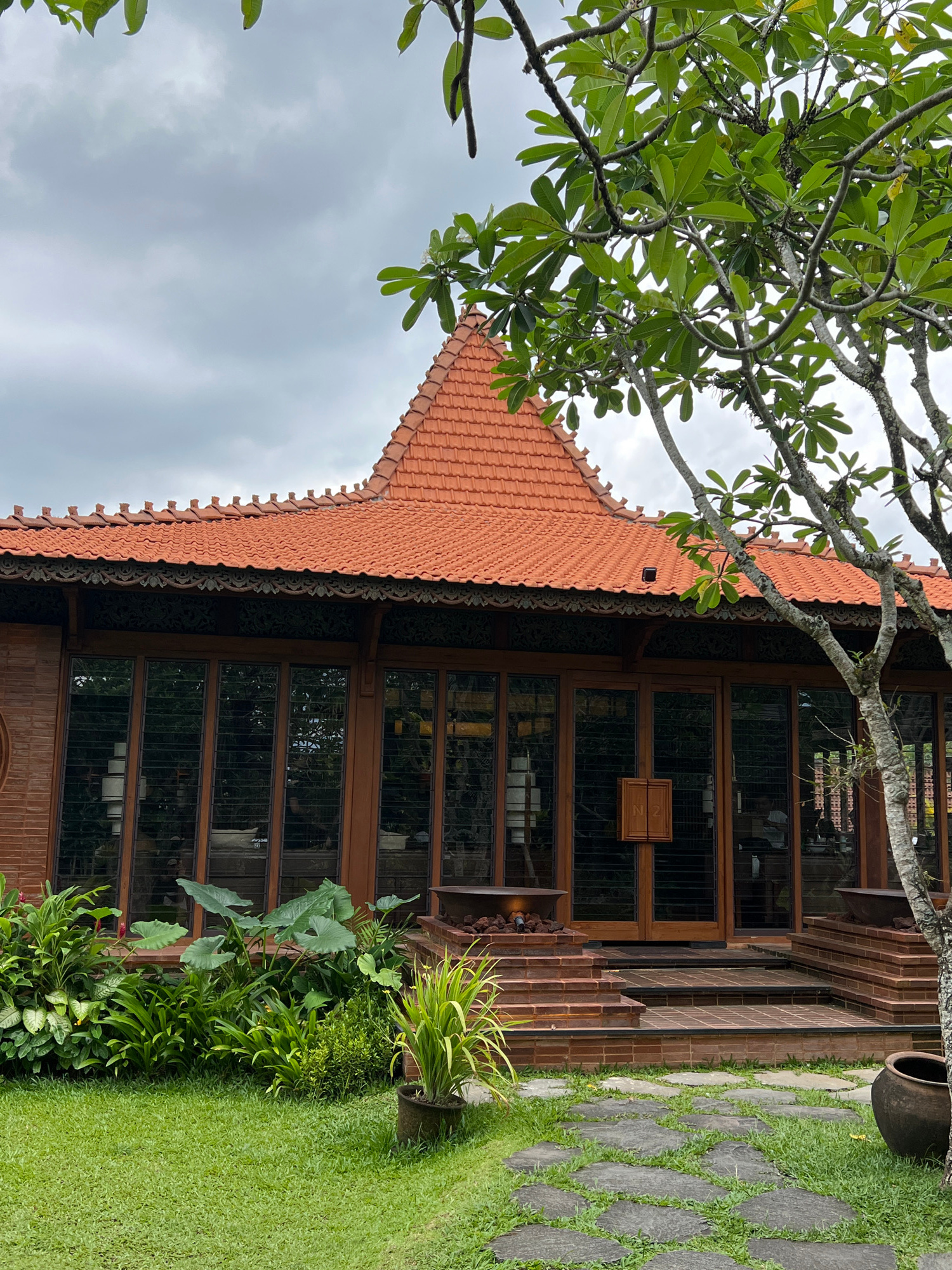 The image shows a building with a red-tiled roof, brown wooden framed windows, and a stone pathway in a grassy yard. The building facade is partially obscured by a tree with green leaves. There are va…read more