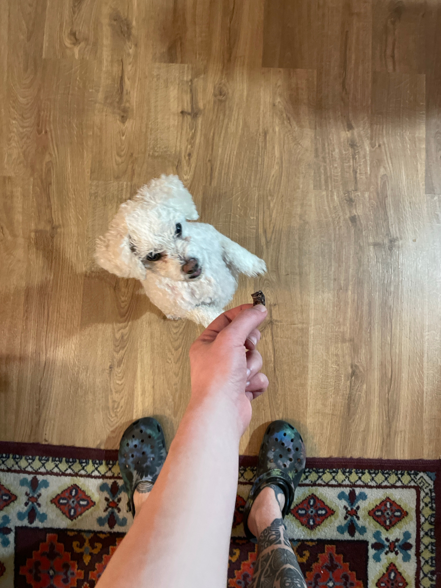 A small white dog sits on a light brown wood floor, looking up at a hand holding a brown treat. The hand is pale and the person is wearing colorful Crocs. A patterned rug is on the right side of the i…read more