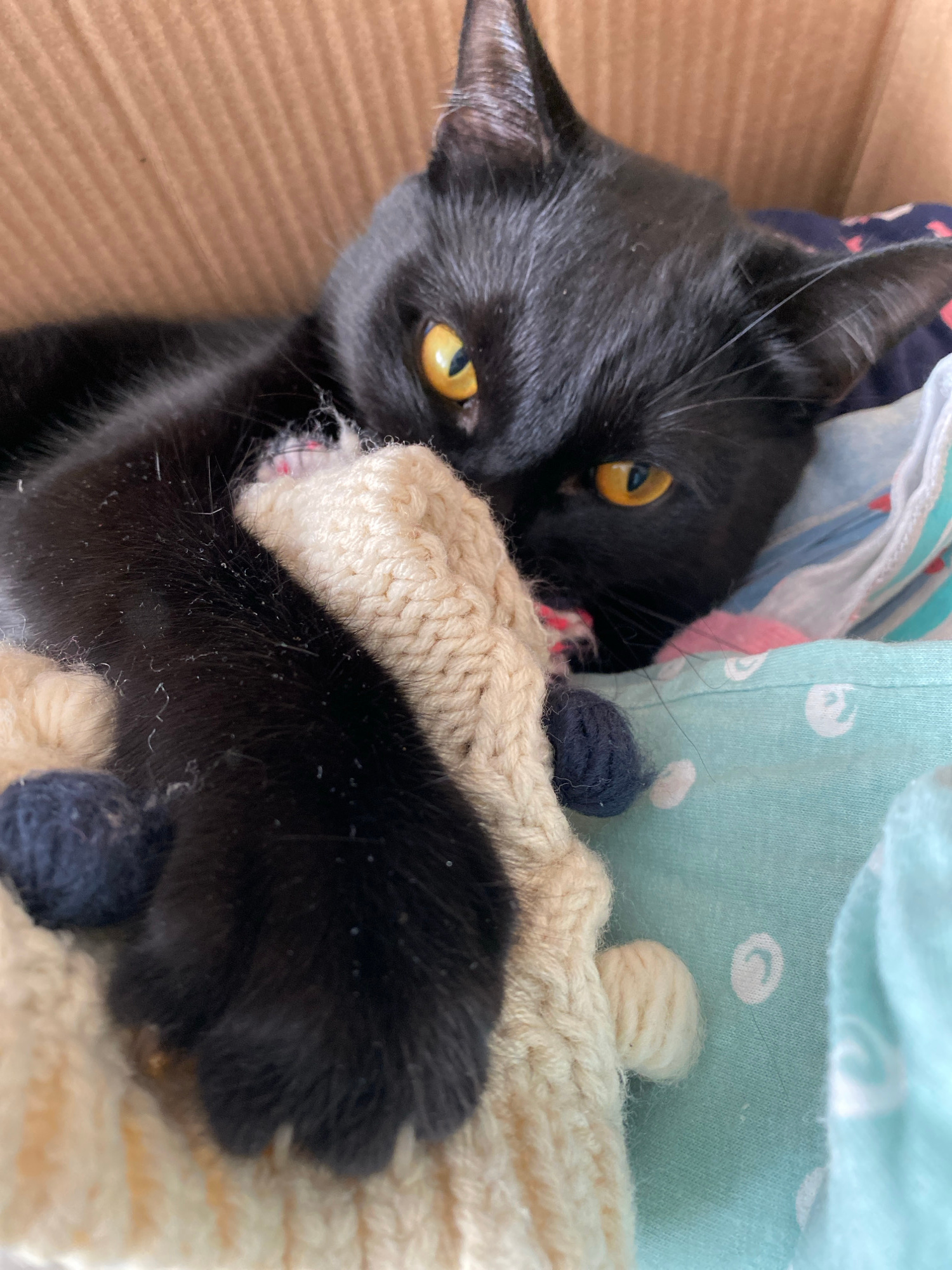 A black cat with yellow eyes is lying in what appears to be a cardboard box, amidst colorful fabrics and a beige knitted object with blue yarn balls attached. The cat's paw is grasping the knitted ite…read more