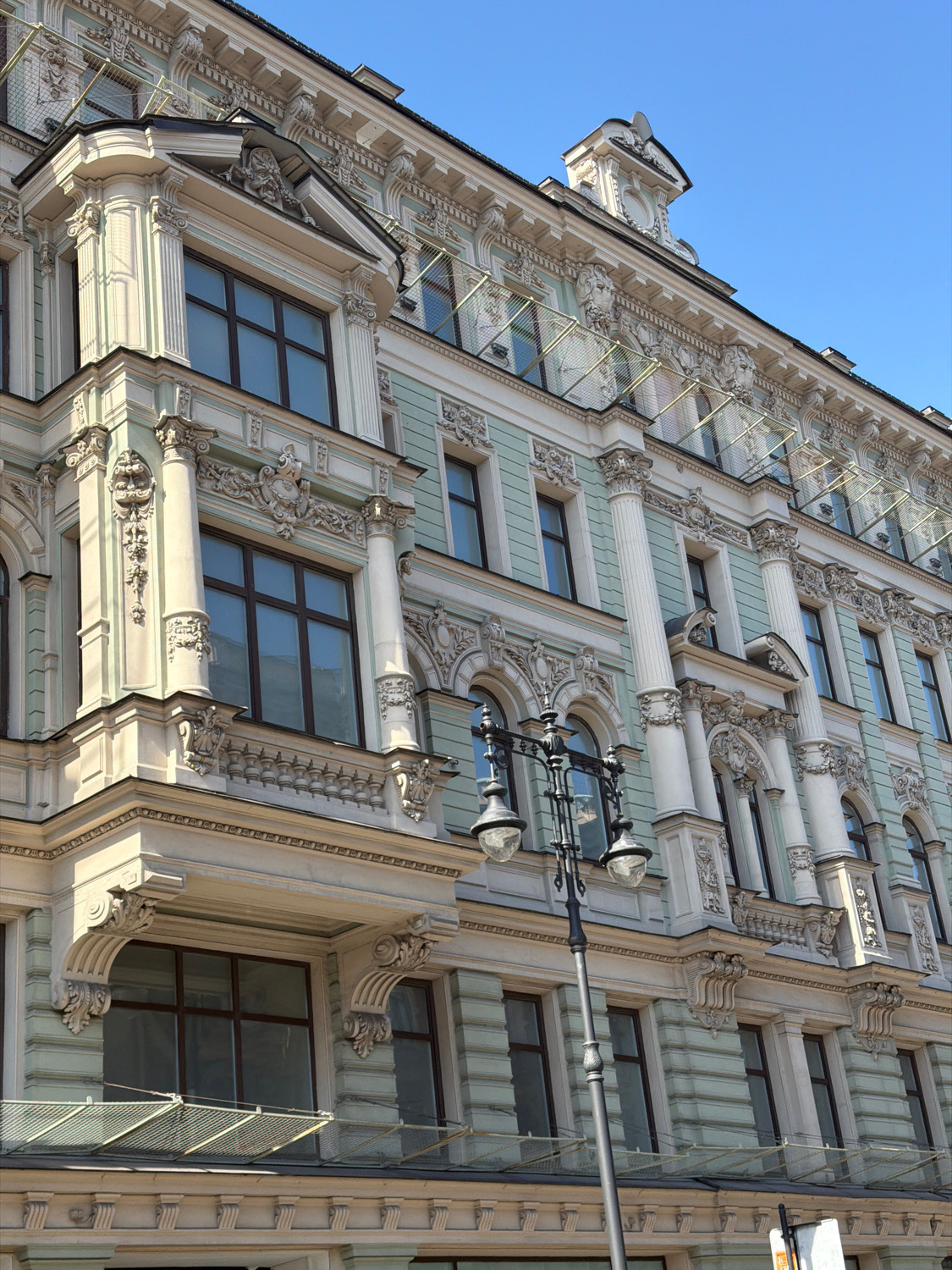 The image presents a low-angle, upward view of the highly ornate facade of a historic building, likely situated in Saint Petersburg, Russia, under a clear blue sky. The multi-story structure is distin…read more