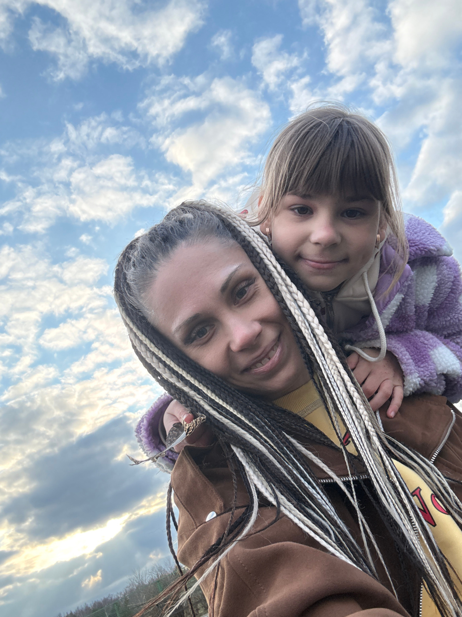 The image shows two people, a woman and a child, taking a selfie against a sky background. The woman, who appears older, is at the bottom of the frame, smiling. She has light skin and braided hair witβ¦read more