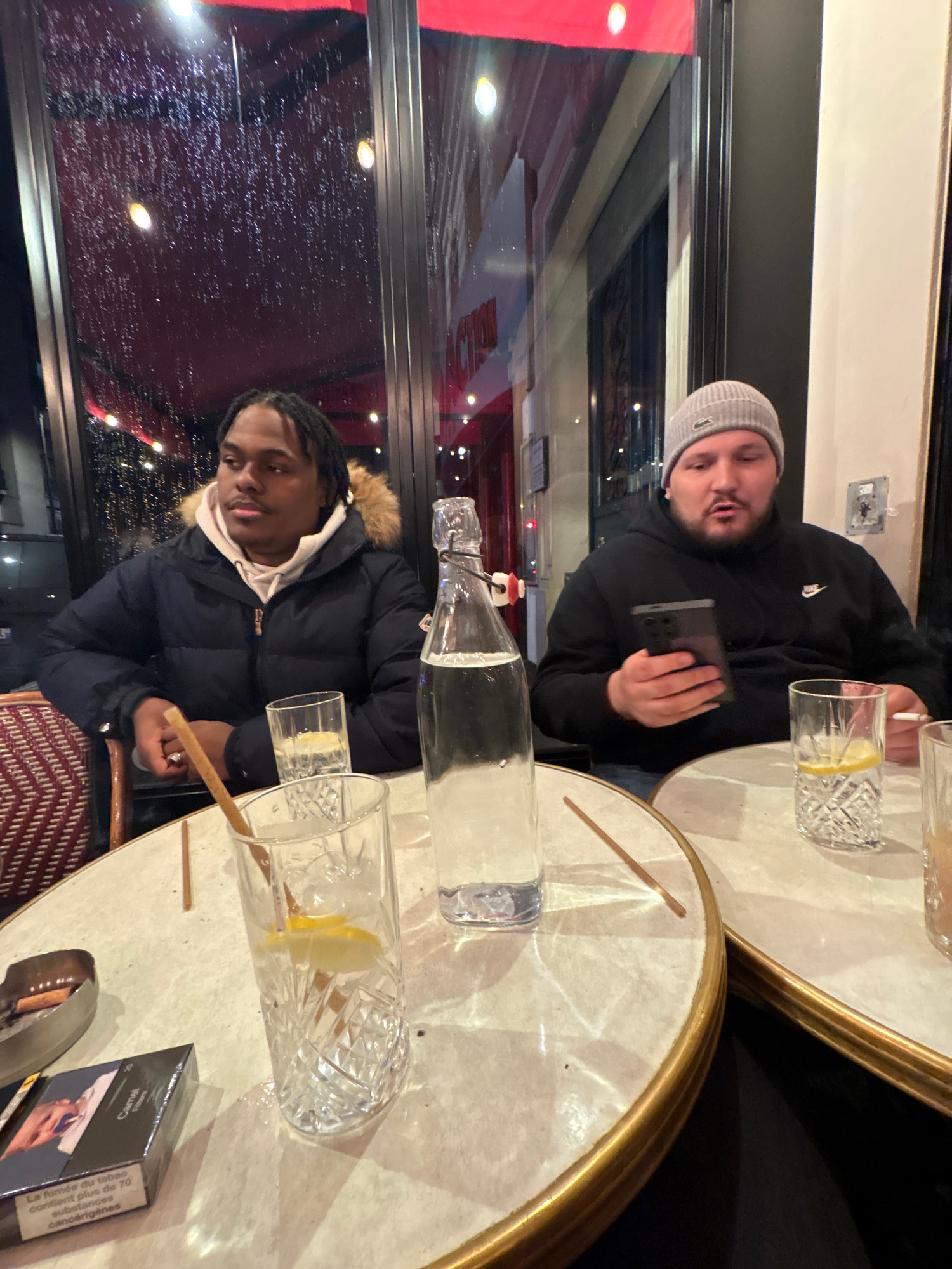 Two adult males are seated at small, round marble-topped tables with gold rims inside a cafe in Paris, France, at night. Rain or condensation streaks the large window behind them, reflecting exterior…read more
