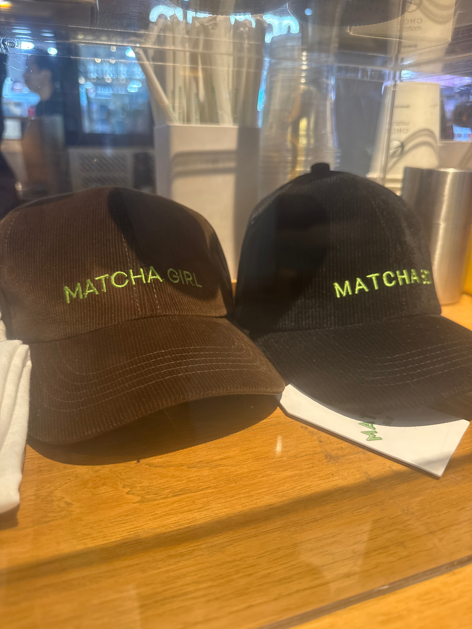 Two baseball caps are displayed on a light brown wooden surface, likely a counter or shelf, in an indoor commercial setting such as a cafe or shop in Kuta Selatan, Indonesia. The top cap is black wit…read more