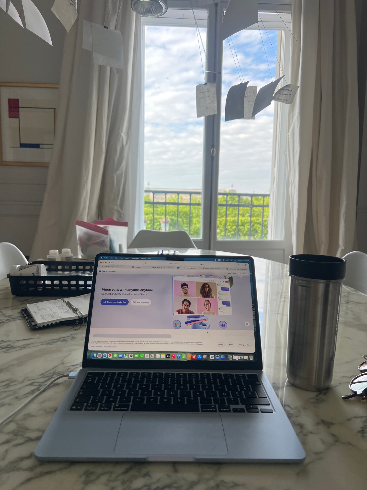 This media file captures a bright, organized workspace by a window, likely in Paris, France. **Subjects:** The primary objects include a silver MacBook laptop, an iPad displaying the Microsoft Teams…read more