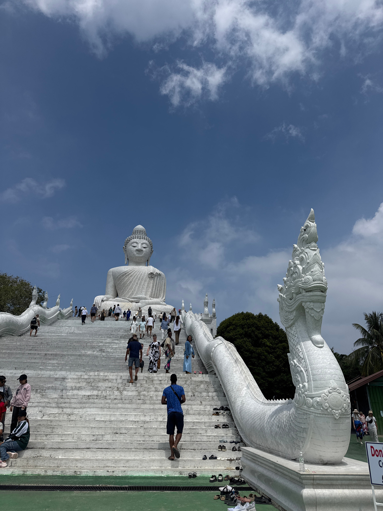 The image shows the Great Buddha of Phuket, a 45-meter tall white marble statue in Karon, Thailand. It features a grand staircase guarded by serpent statues. Several tourists are present, some walking…read more
