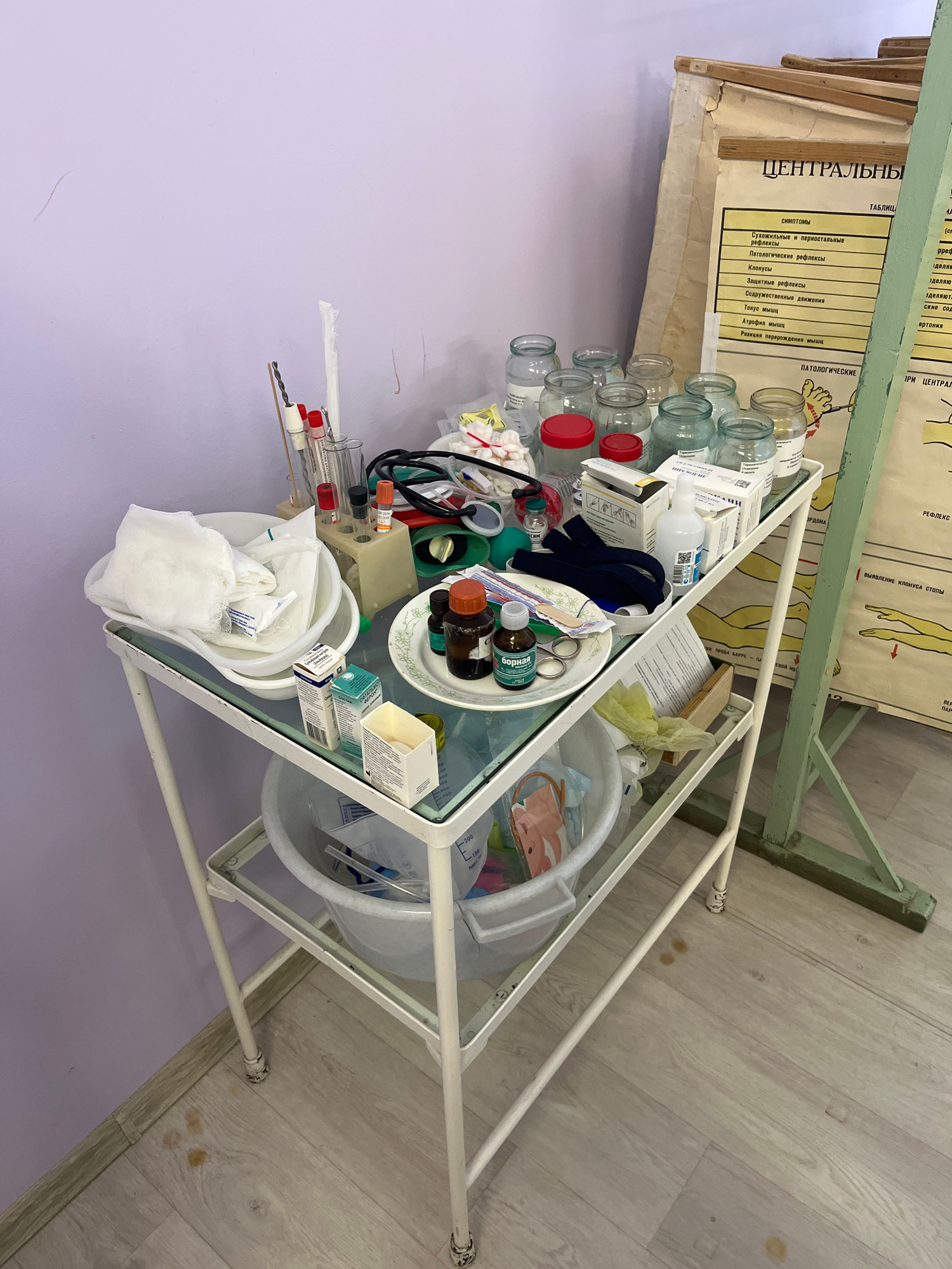 This image depicts an indoor medical setting, likely a clinic or educational facility, located in Chaikovsky, Russia. A white, two-tiered metal medical trolley with glass shelves stands in the foregro…read more