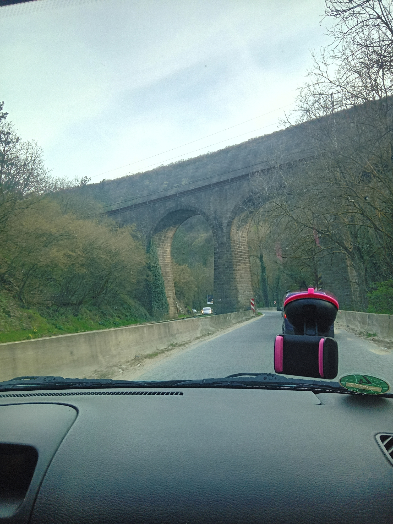 The image, taken from inside a vehicle, shows a viaduct running parallel to a road. The viaduct appears to be made of stone or brick and has a series of arches. The vehicle's dashboard and a phone hol…read more