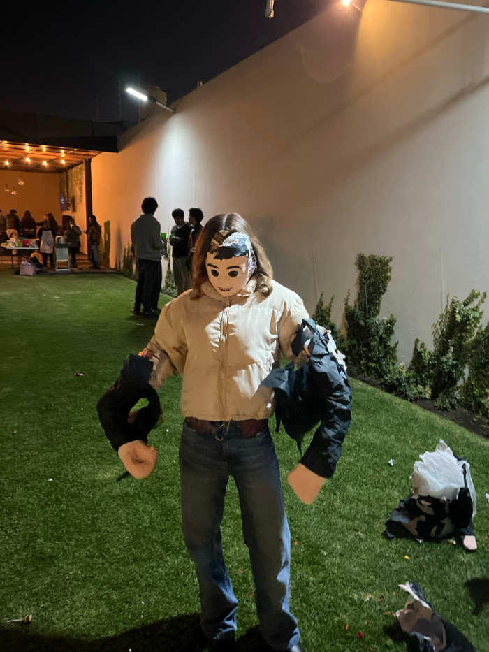 A person stands on green grass, wearing jeans, a tan jacket, and a mask. Next to them is a torn-up piñata. In the background, other people are seated at tables, and some are standing nearby. A white w…read more