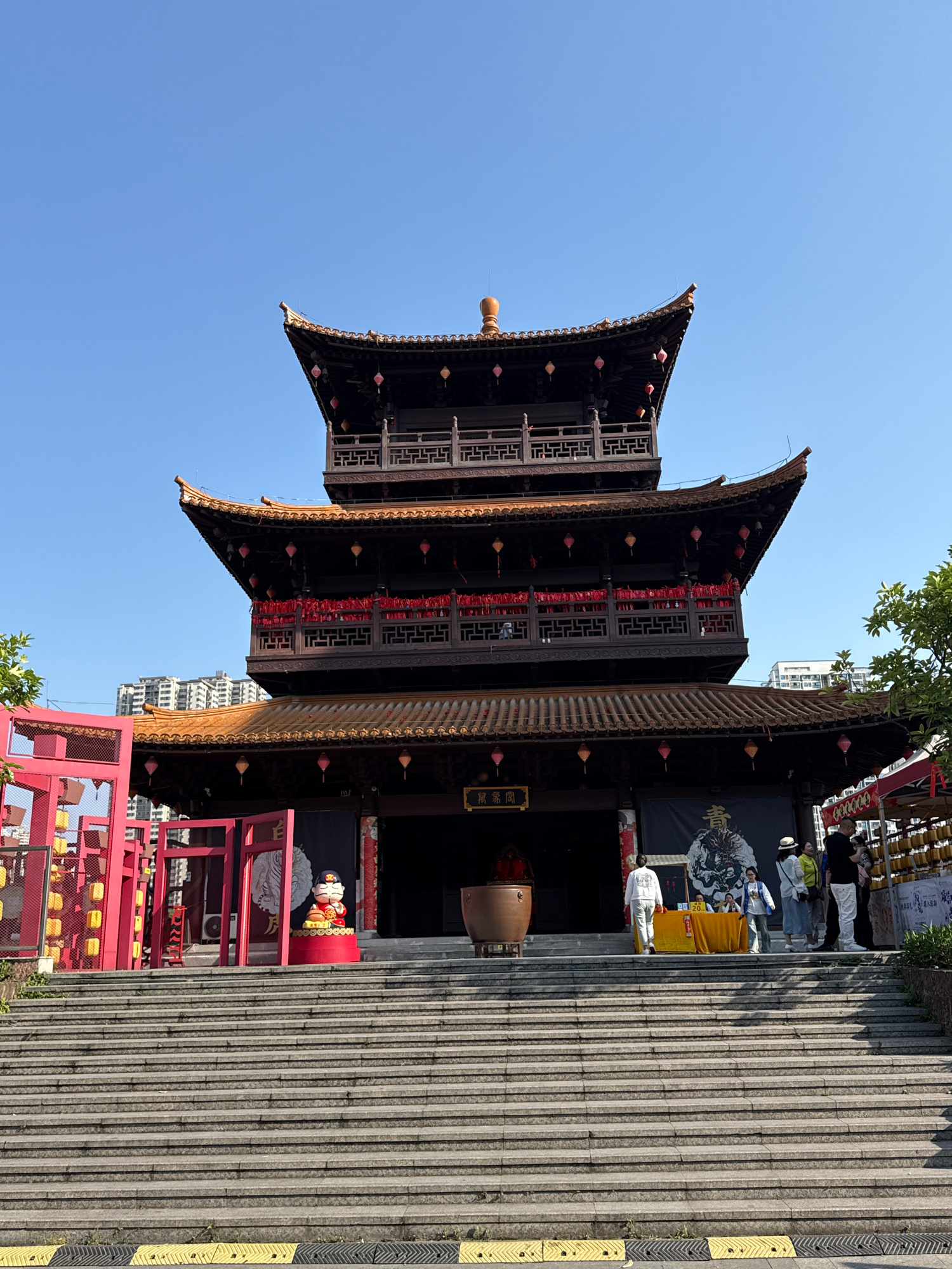 The image depicts a multi-tiered pagoda-style building in Shapingba District, China, set against a clear blue sky. The building's facade is predominantly dark, with ornate wooden detailing and traditi…read more