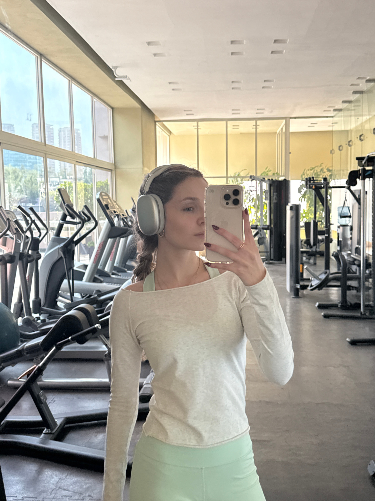 A woman with dark hair, wearing a gray sweatshirt and light green leggings, is taking a selfie in a gym. She is holding a light-colored smartphone in her right hand, partially obscuring her face. She…read more
