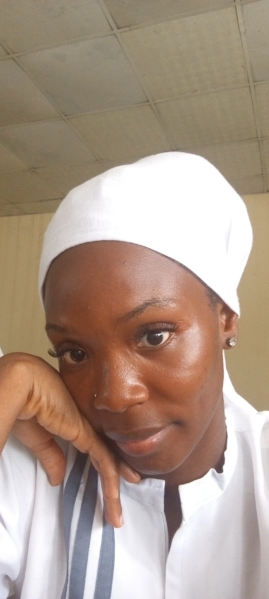 A close-up shot shows a young woman with dark skin wearing a white head covering. She has dark eyes and a small nose piercing. Her left hand is resting on her face. She is wearing a white shirt with g…read more