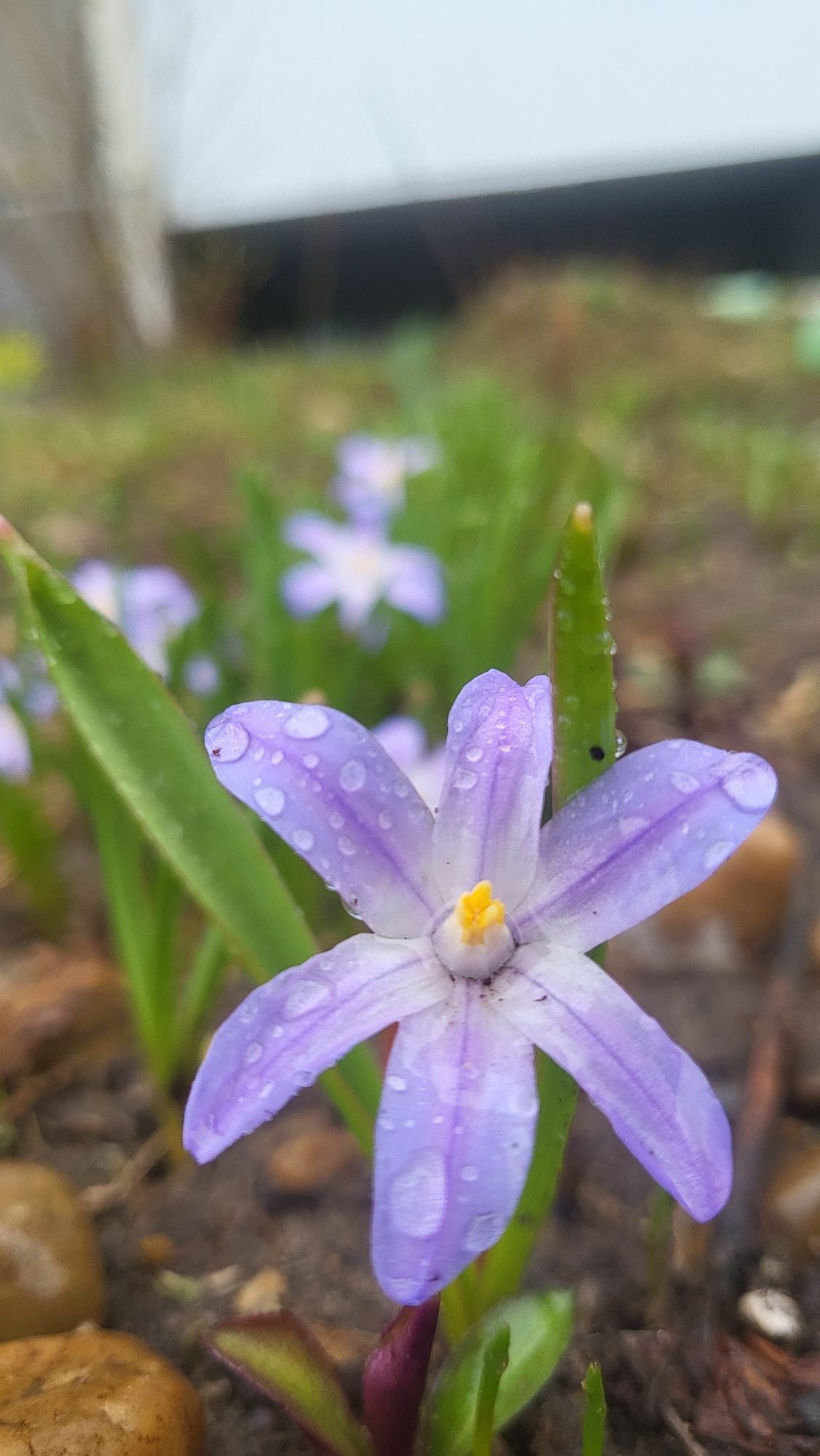 The image displays a close-up, slightly tilted view of a delicate light purple flower, likely a Chionodoxa (Glory-of-the-Snow) or similar early spring bloom. The flower has six petals, transitioning f…read more