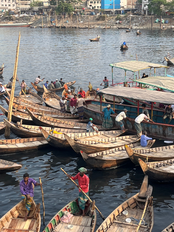 The image depicts a busy river scene in Keraniganj, Bangladesh, characterized by a dense congregation of traditional wooden boats on rippled water. Approximately 30-40 individuals, predominantly adult…read more