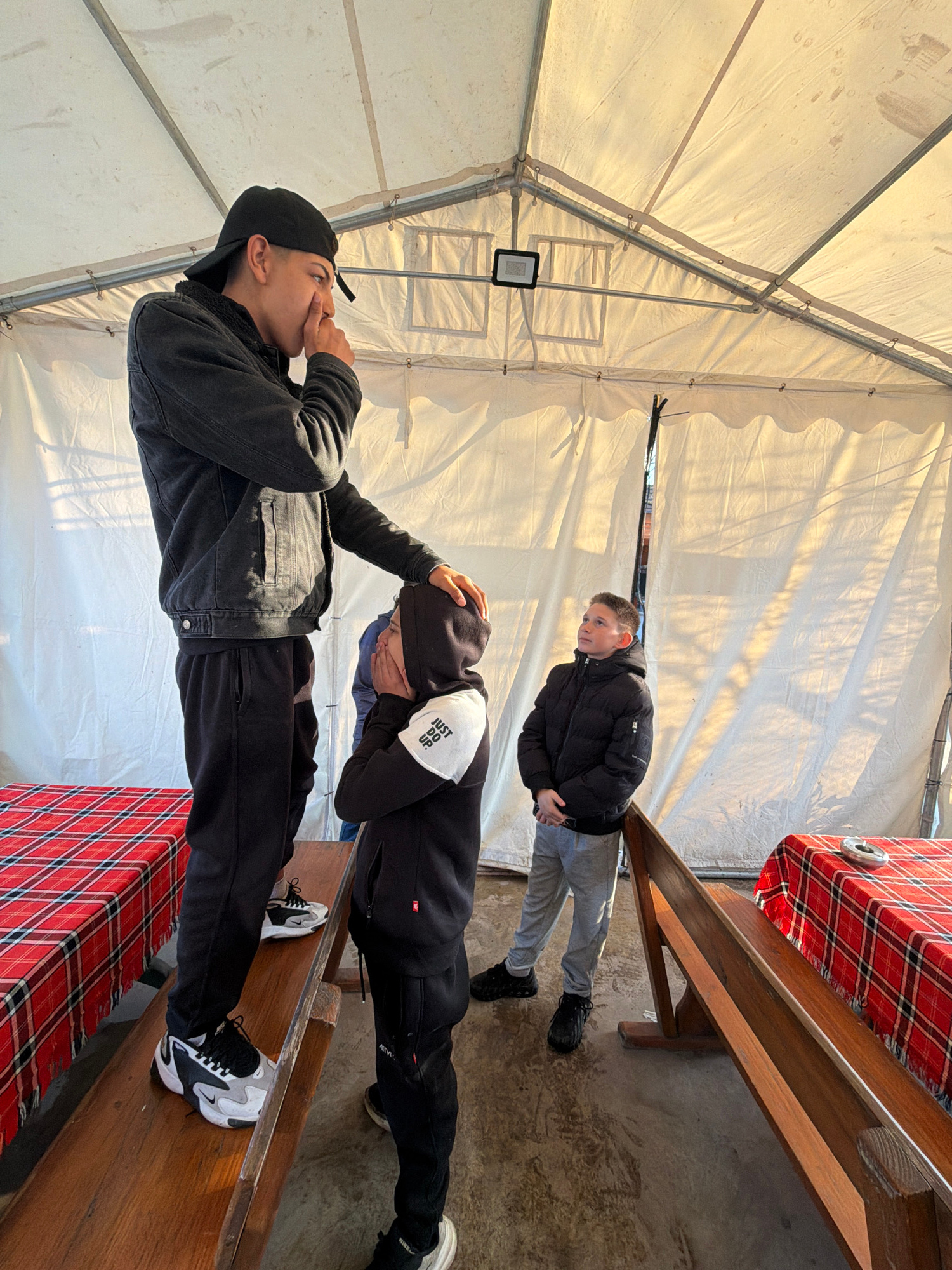 Three young males are sitting on benches inside a tent. The bench is covered with a red-and-black checkered tablecloth. The tent has a white fabric cover with a metal frame. The location is Zlatna Pan…read more