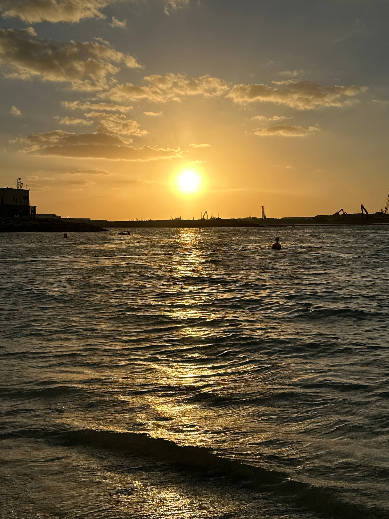 The image displays a coastal sunset scene in Dubai, United Arab Emirates, likely near a port or a significant construction area. The sun, a bright yellow-orange disc, is positioned in the upper right…read more