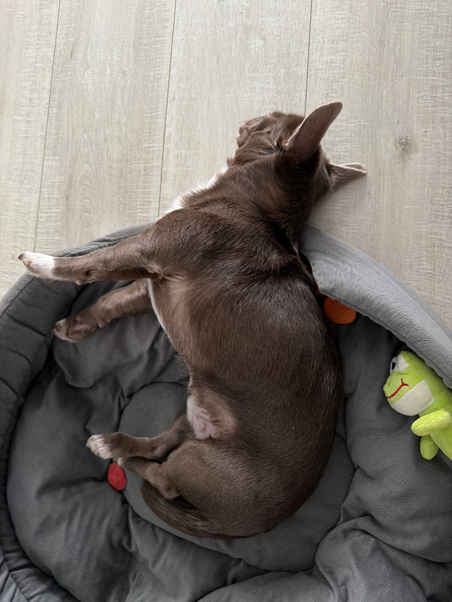 A brown Chihuahua dog is asleep in a gray dog bed on a light gray wooden floor. The bed also contains a green frog stuffed toy and a small orange ball. A red object is at the foot of the dog. The dog…read more