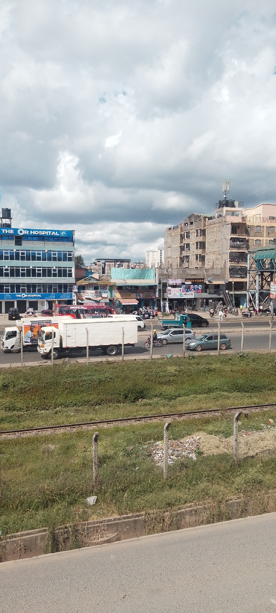 The image captures a busy street scene in Nairobi, Kenya. The foreground features a concrete barrier, green vegetation, and a section of railway tracks enclosed by wire fencing. Beyond this, a multi-l…read more