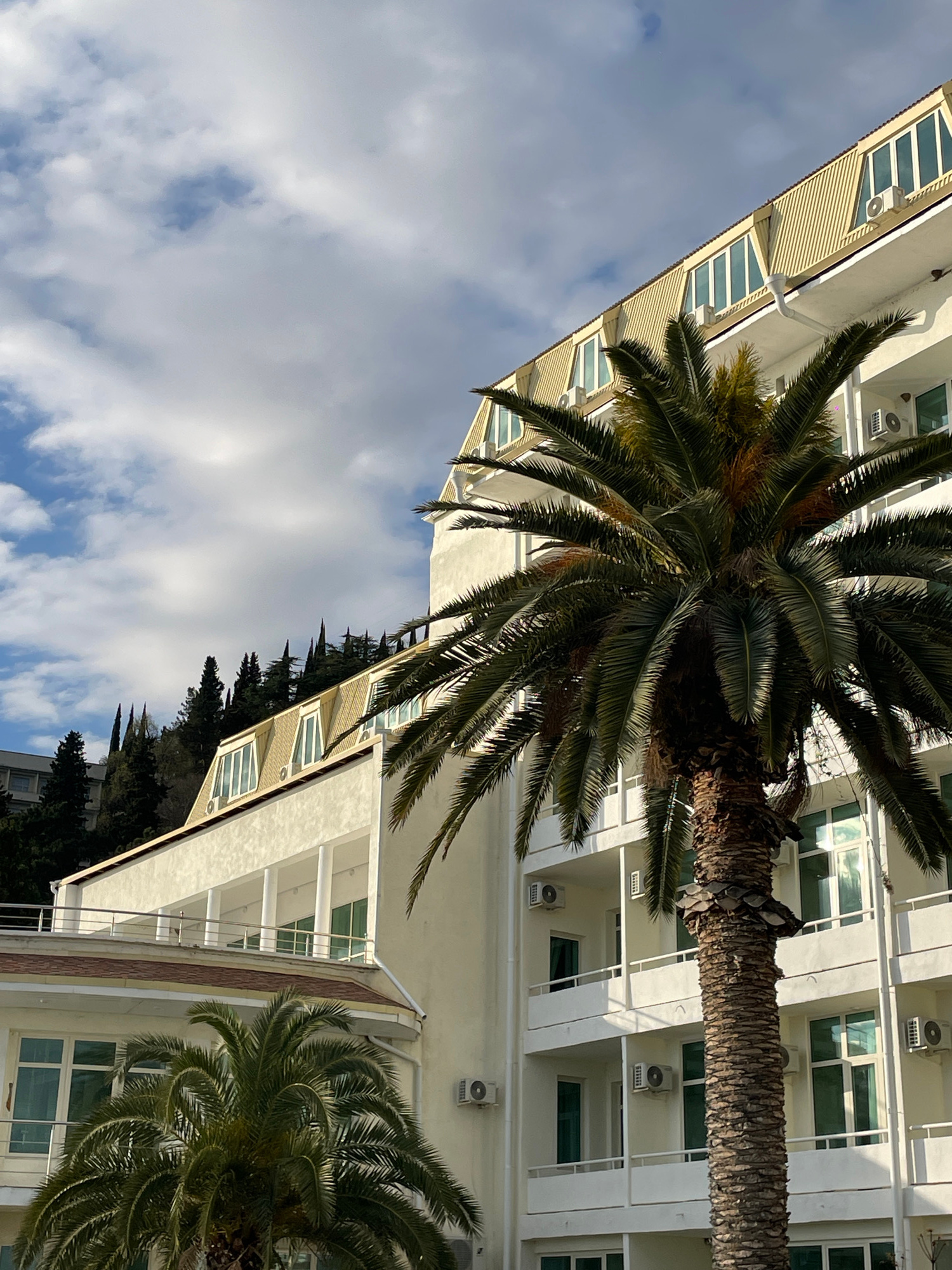 Captured from a low angle, the image shows a tall, white building with multiple floors and a facade featuring windows and air conditioning units. Two palm trees dominate the foreground and midground.…read more