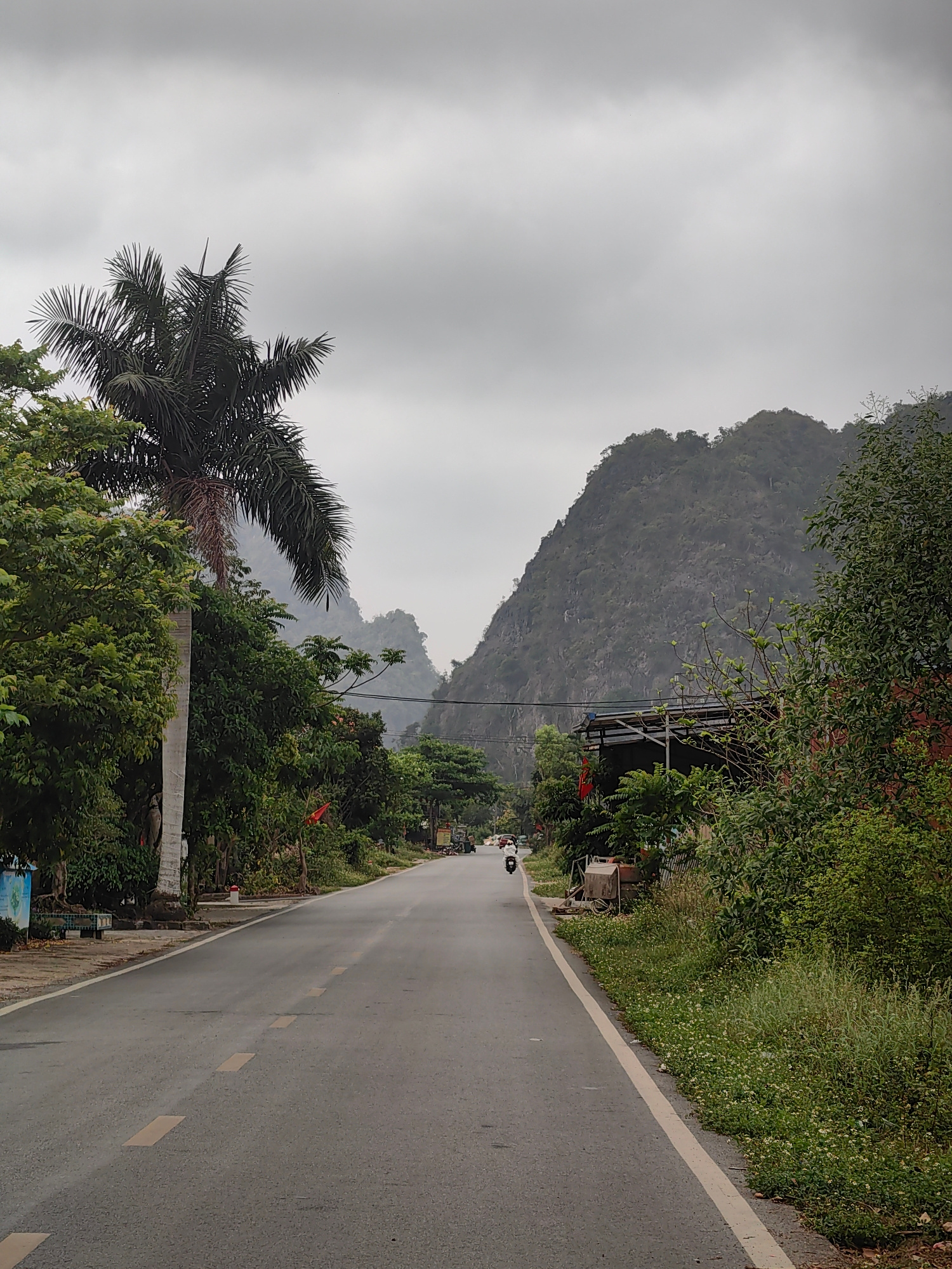 The image depicts a straight, paved road in a rural area. The road surface is dark gray with intermittent yellow dashed lines. On either side of the road are lush green trees and vegetation. A tall pa…read more