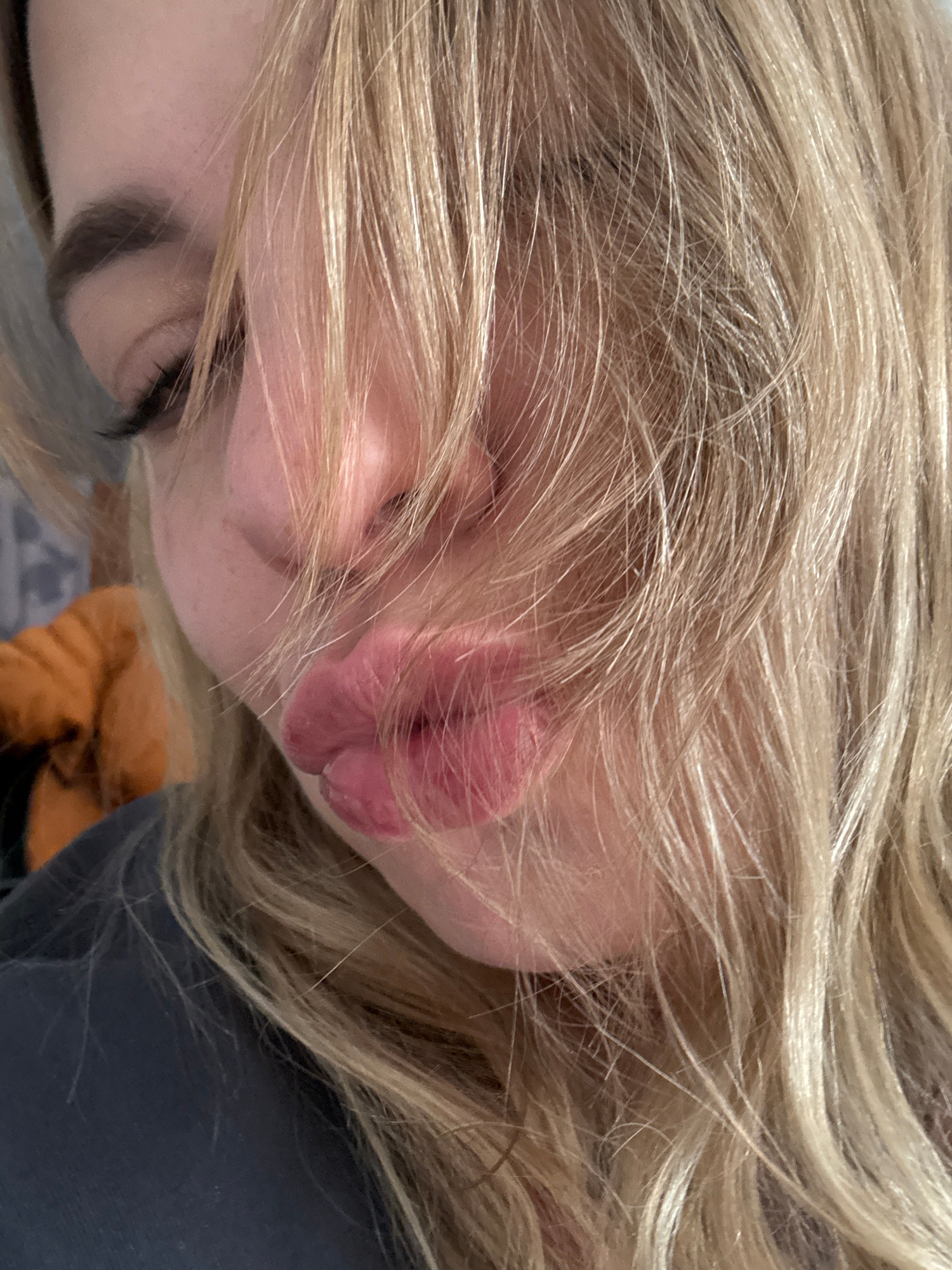 Close-up image of a person's face with blonde hair covering part of the face. The lips are visible, and part of the nose and one eye can be seen. A shoulder is visible in the lower right corner of the…read more