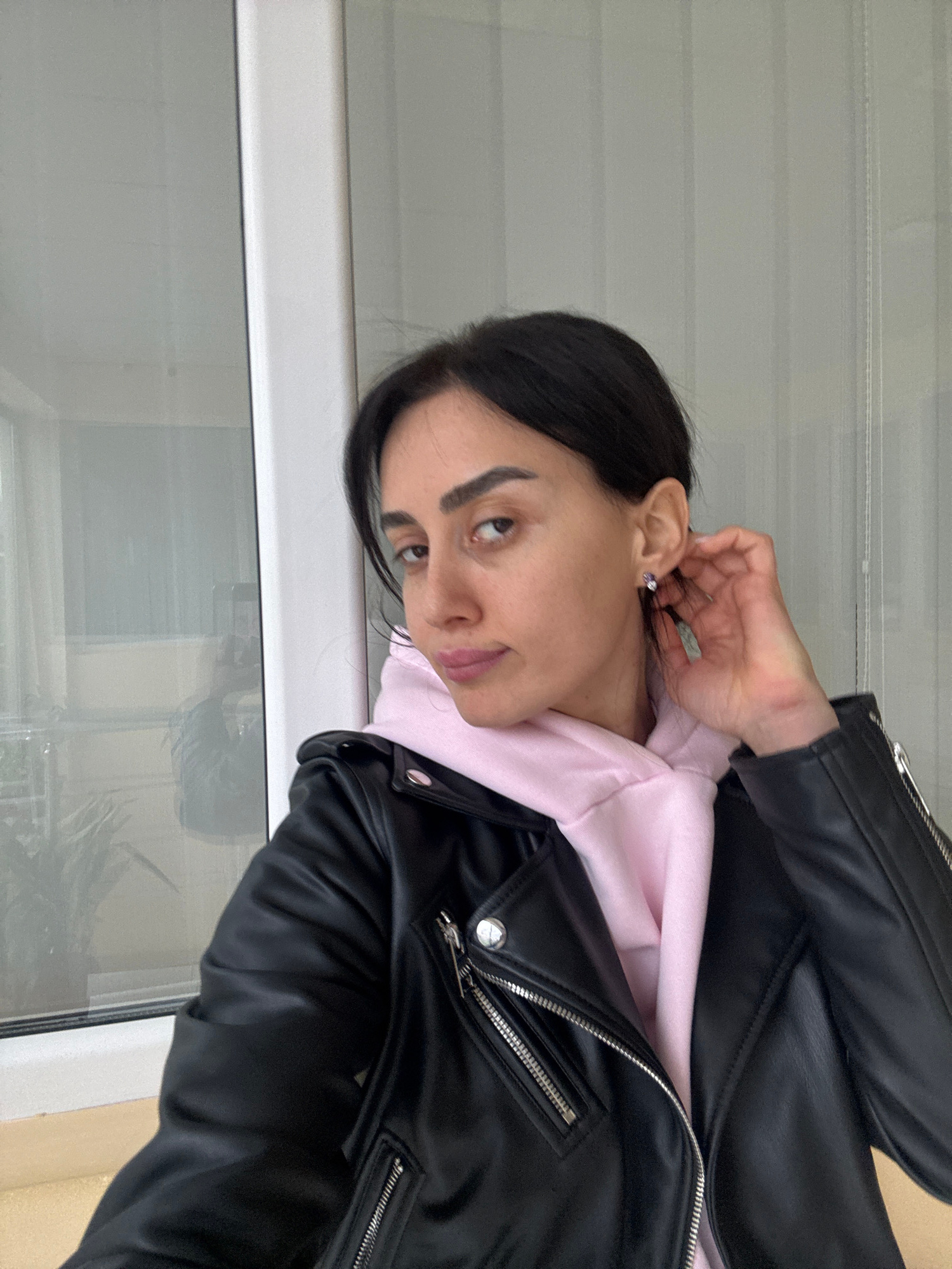 A woman is visible in this portrait-style shot. She has dark hair and is wearing a black leather jacket over a pink hoodie. She is touching her ear. The background appears to be a window with some out…read more