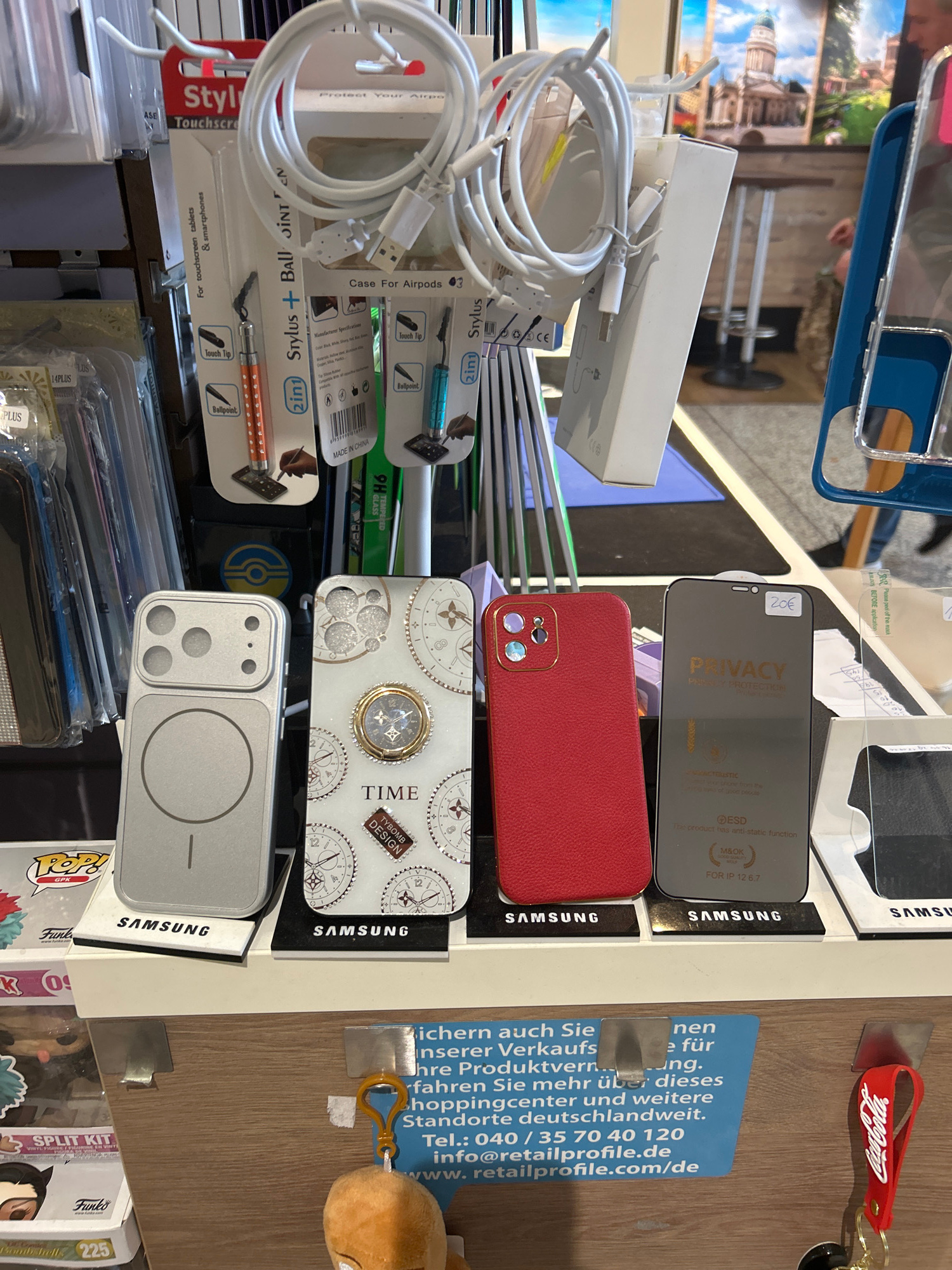 The image captures a close-up view of a retail display, likely in a shop or stall, showcasing a variety of mobile phone accessories and other small merchandise. The setting appears to be indoors, unde…read more