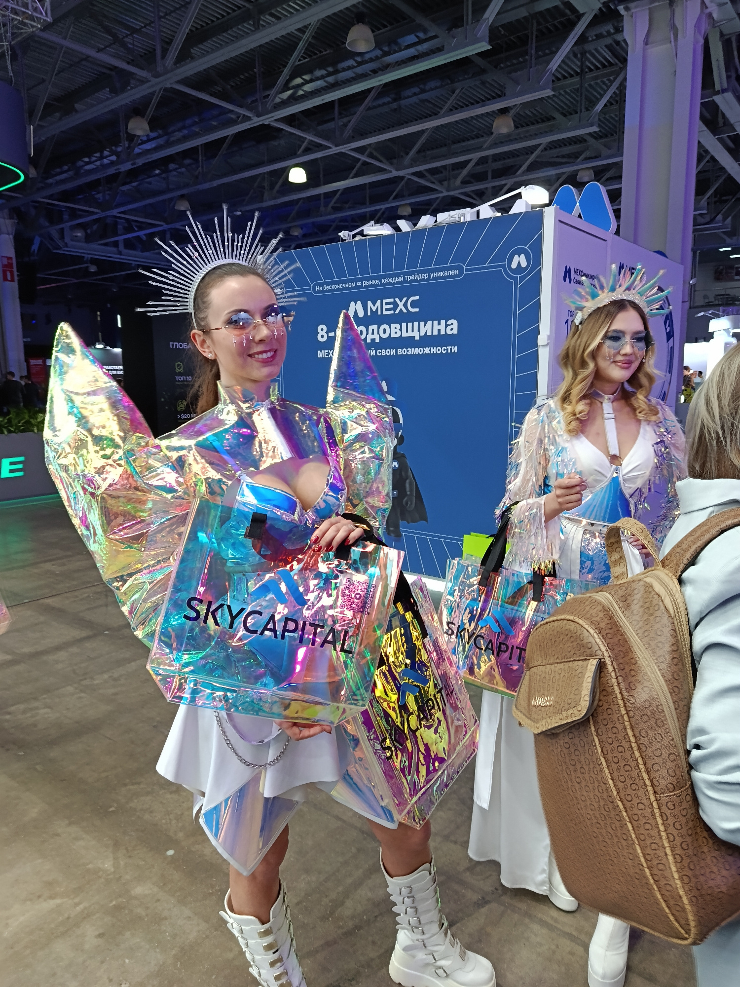 The image shows two women, likely models or promotional staff, at an event or convention in Moscow, Russia. The woman in the foreground is wearing a striking, iridescent costume with a starburst headp…read more