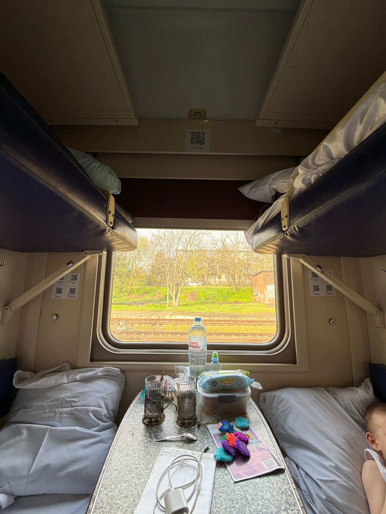 The image depicts the interior of a train compartment. There are two beds on either side of the compartment, one raised and one lowered. A person is lying on the lower bed on the right side, with only…read more
