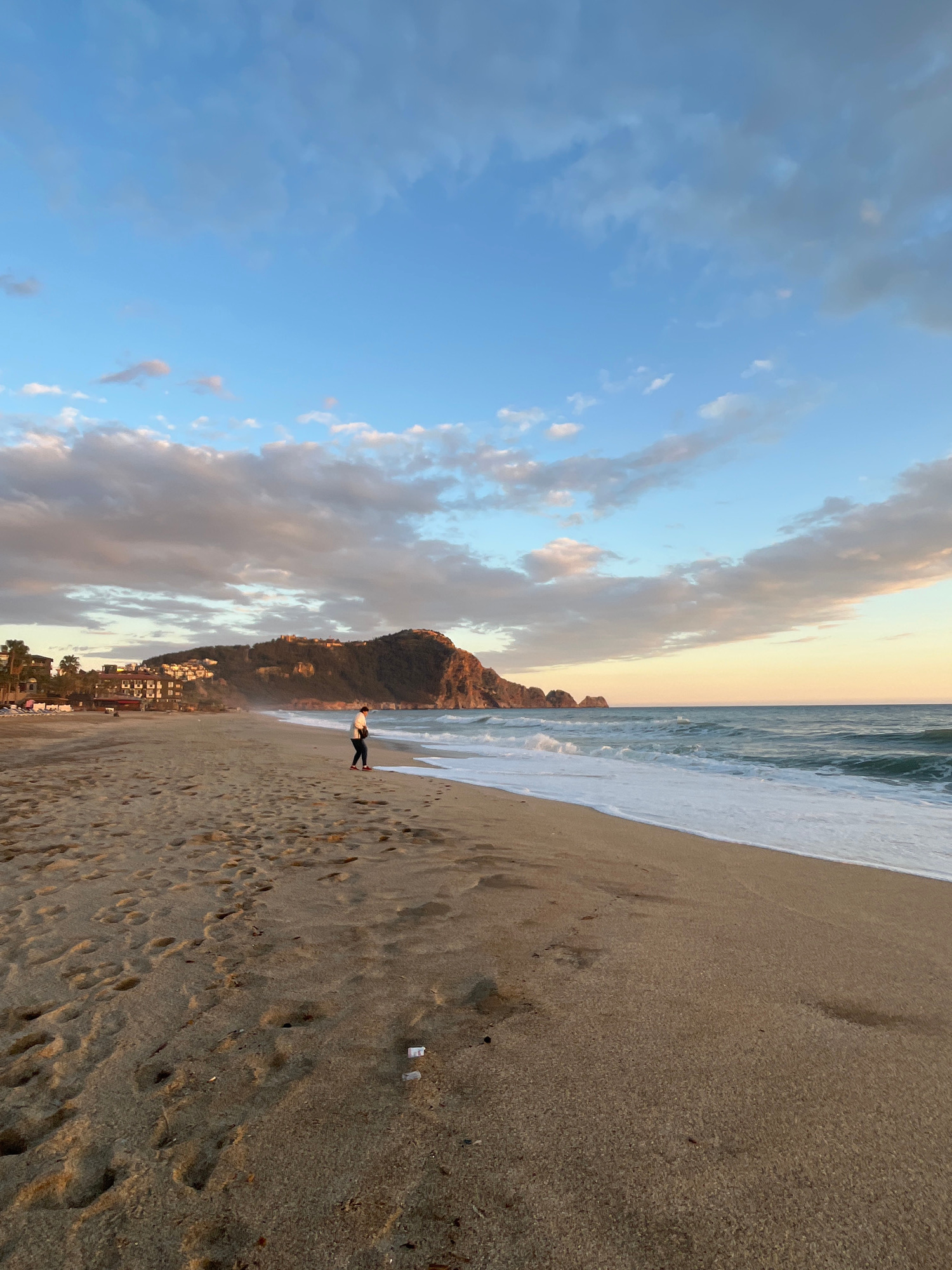 The scene is a beach in Alanya, Turkey. A sandy shore meets the ocean with foamy waves. In the distance, a mountain with buildings along its base is visible. Above, the sky transitions from blue to or…read more
