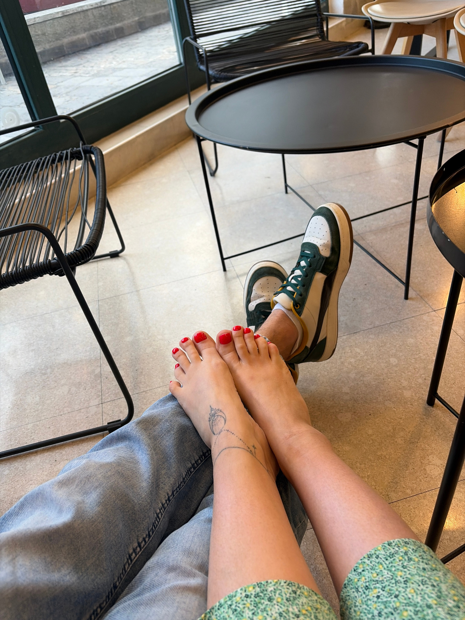 The image captures a top-down view, likely taken indoors, presenting a scene featuring a person's lower limbs and surrounding objects. The person is wearing blue jeans and a green, patterned dress. Th…read more