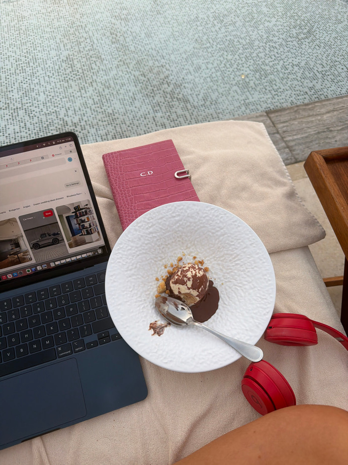 This image depicts a poolside lounge area in Dubai, United Arab Emirates. A dark blue laptop is open on a light-colored, possibly beige, cushioned lounge chair. The laptop screen displays a Pinterest…read more