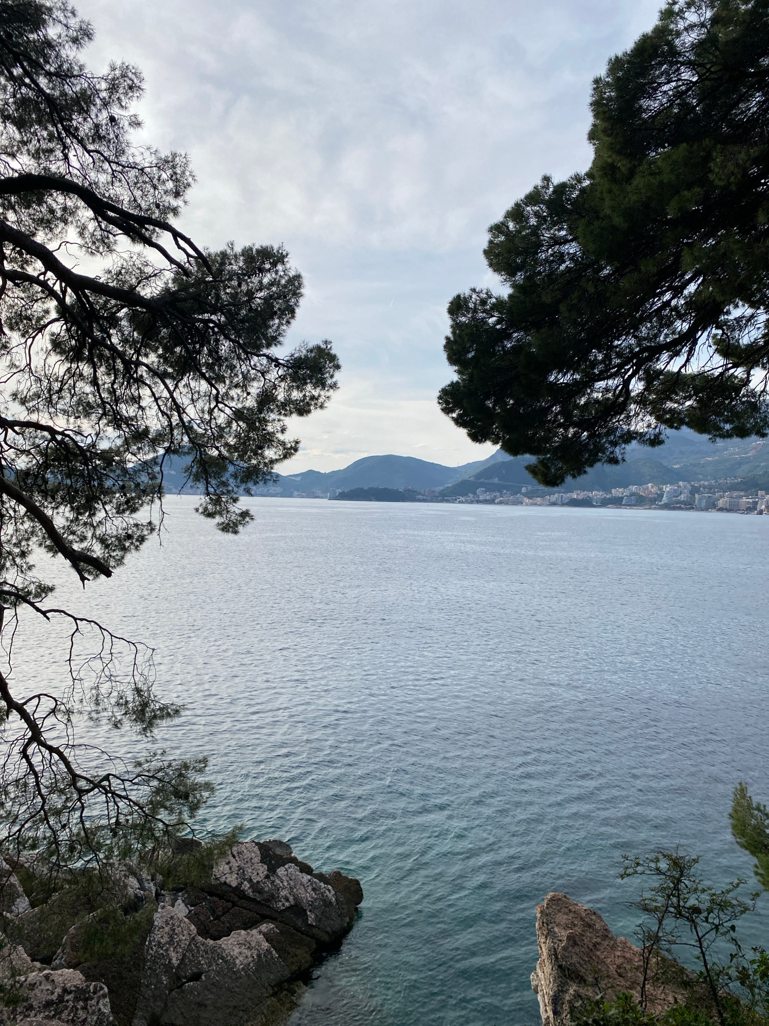 The image depicts a view of the Adriatic Sea from a high vantage point in Sveti Stefan, Montenegro. The sea appears calm, with subtle wave patterns visible on its surface. Rocky cliffs are visible on…read more