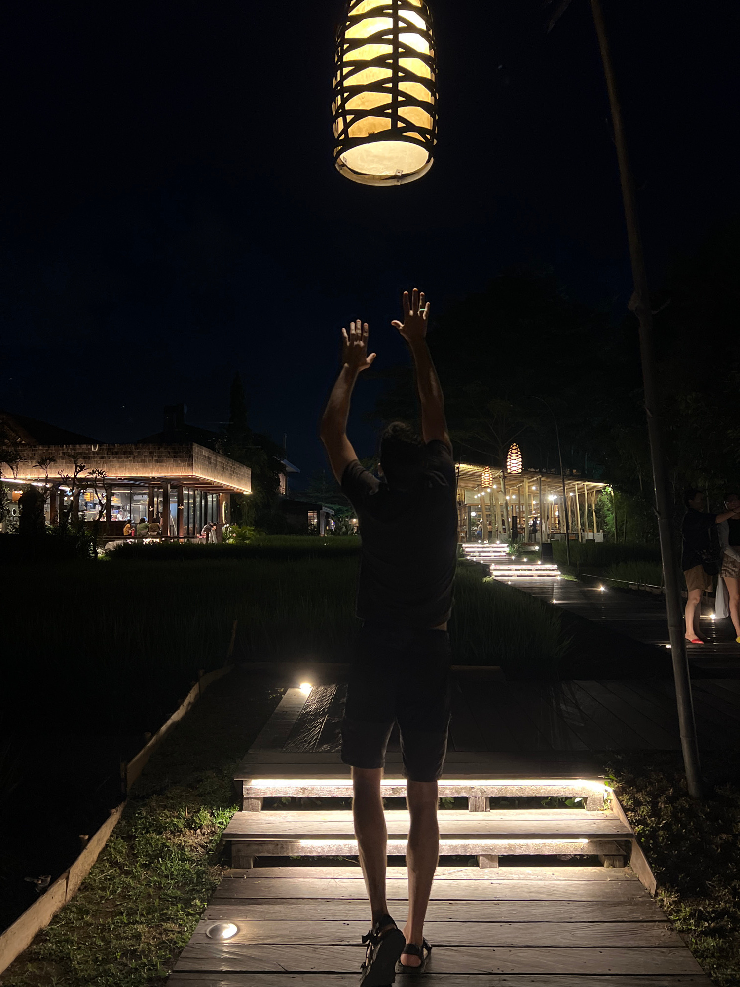 A night scene captured in Ubud, Indonesia, features a man in shorts and a t-shirt standing on a wooden platform illuminated with lights, with his arms outstretched toward a lantern. In the background,…read more