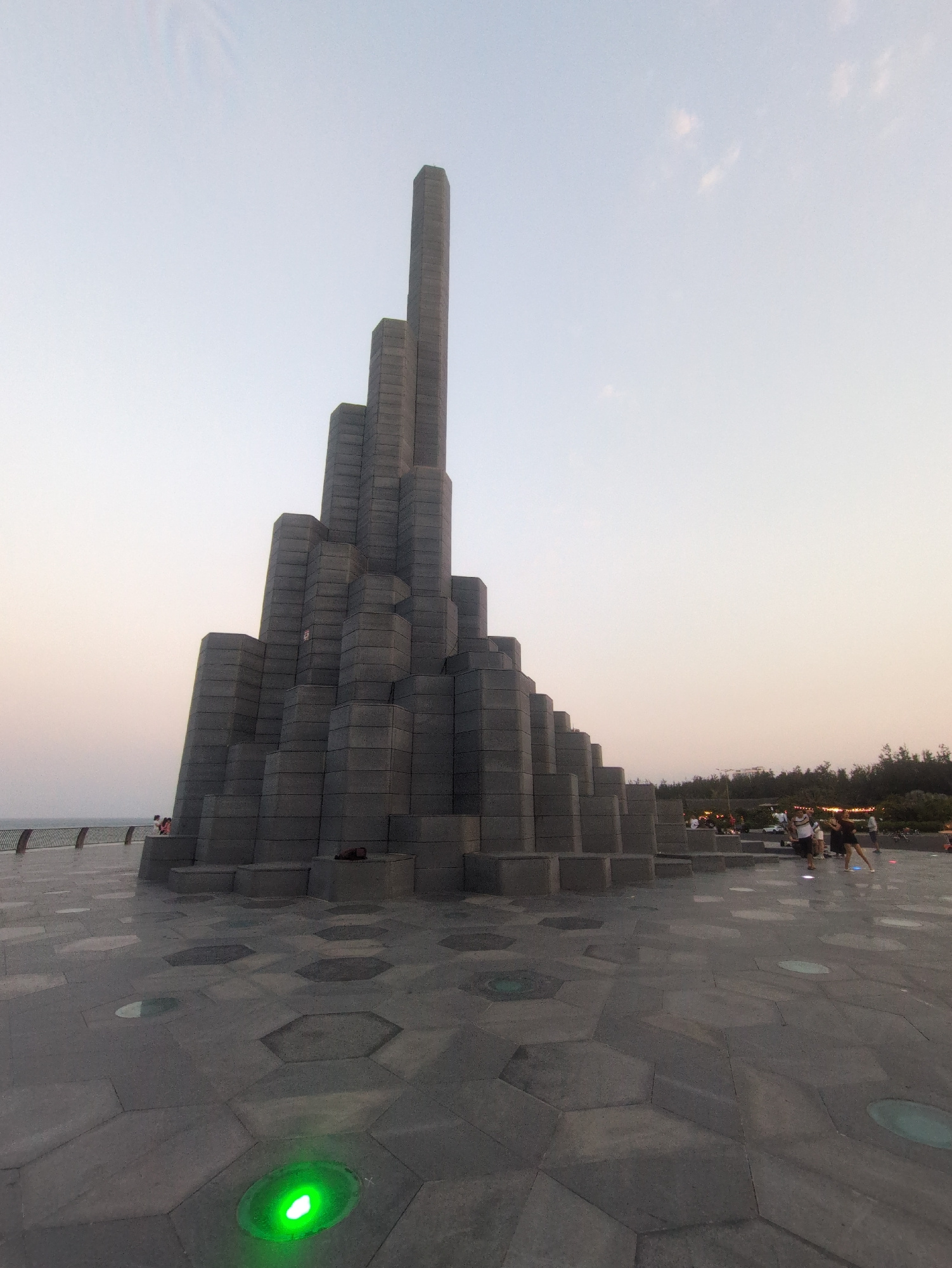The image shows a large, gray monument composed of stacked, rectangular blocks in Binh Kien, Vietnam. The monument is situated on a paved surface with hexagonal patterns and embedded circular lights,…read more