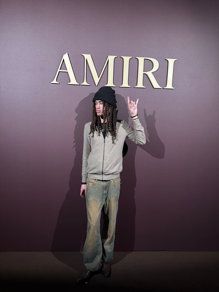 A single individual is depicted in a full-body portrait against a dark plum-colored wall. The setting is an indoor event space or retail environment associated with the Amiri fashion brand in Milan, Iā¦read more