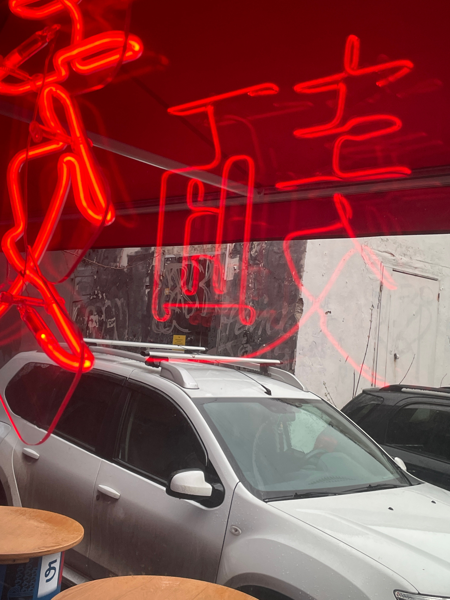 The image depicts a street scene in Perm, Russia, viewed from above. A white vehicle is parked alongside a building with a reflective red sign. Red neon lights create reflections on the vehicle, the s…read more