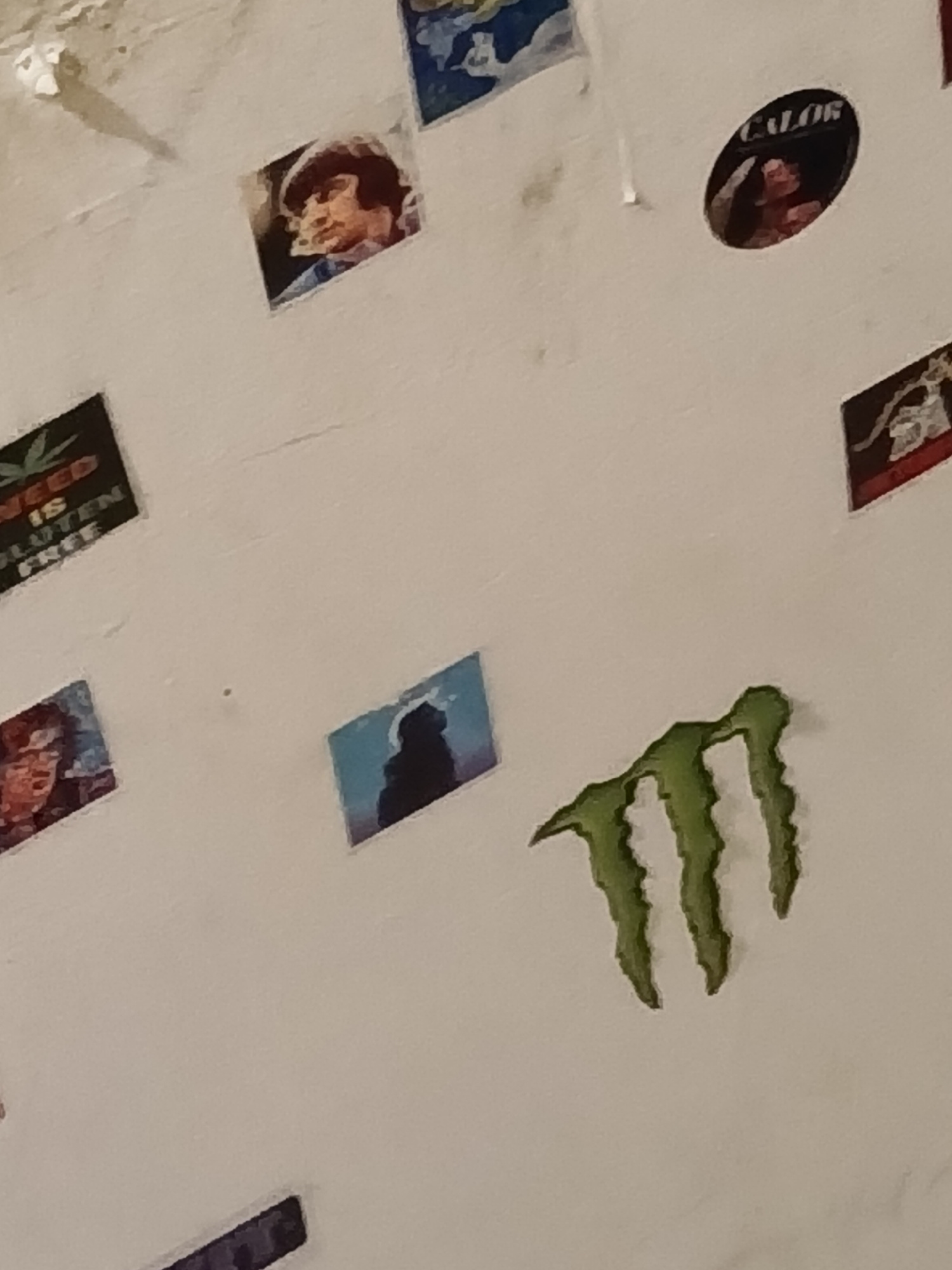 The image displays a light-colored, possibly off-white wall or ceiling surface adorned with a collection of stickers and small posters, suggesting a casual, personalized space. Dominating the upper ri…read more