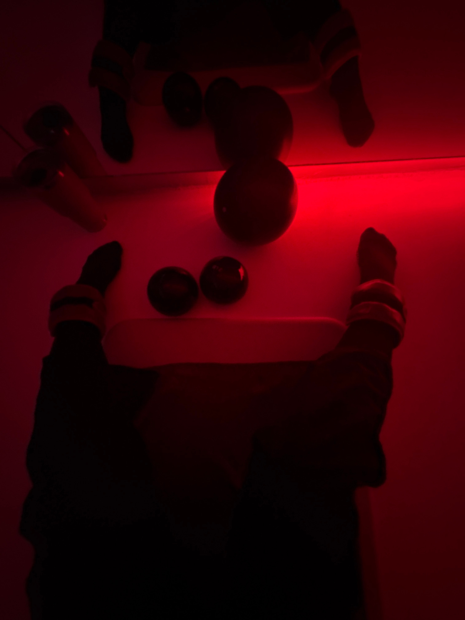 The image shows a person's hands in a red-lit room. One hand is near a door or panel with a white frame, and there appear to be several dark round objects on or near the panel. The other hand is parti…read more