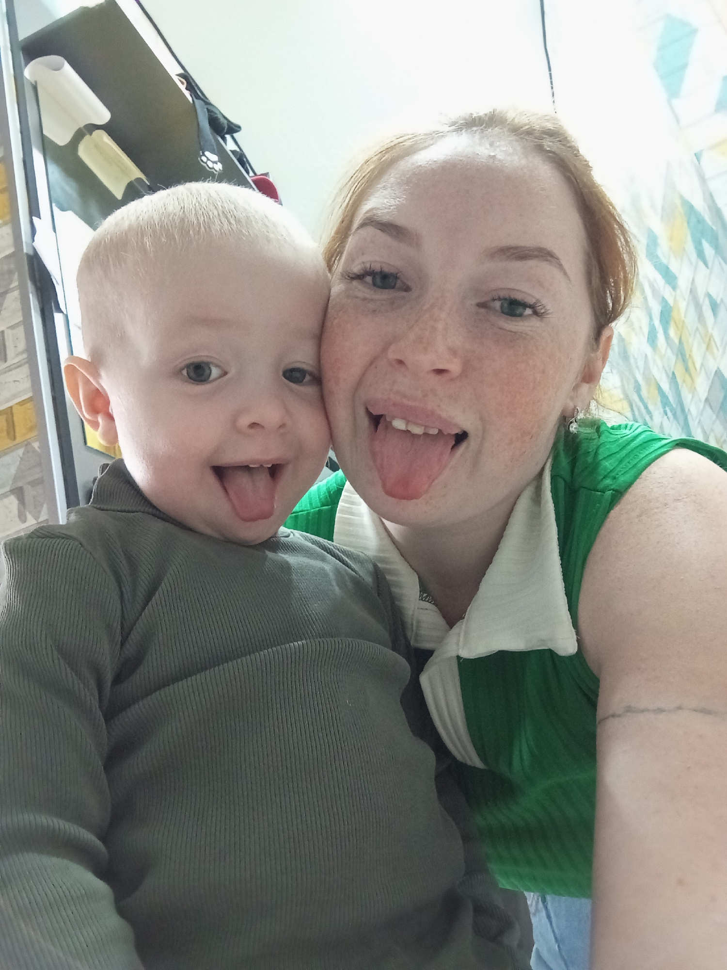 Two people are visible in the image. A baby is lying on top of an adult. Both are sticking their tongues out. The baby is wearing a grey shirt. The adult is wearing a green shirt with a white collar.…read more