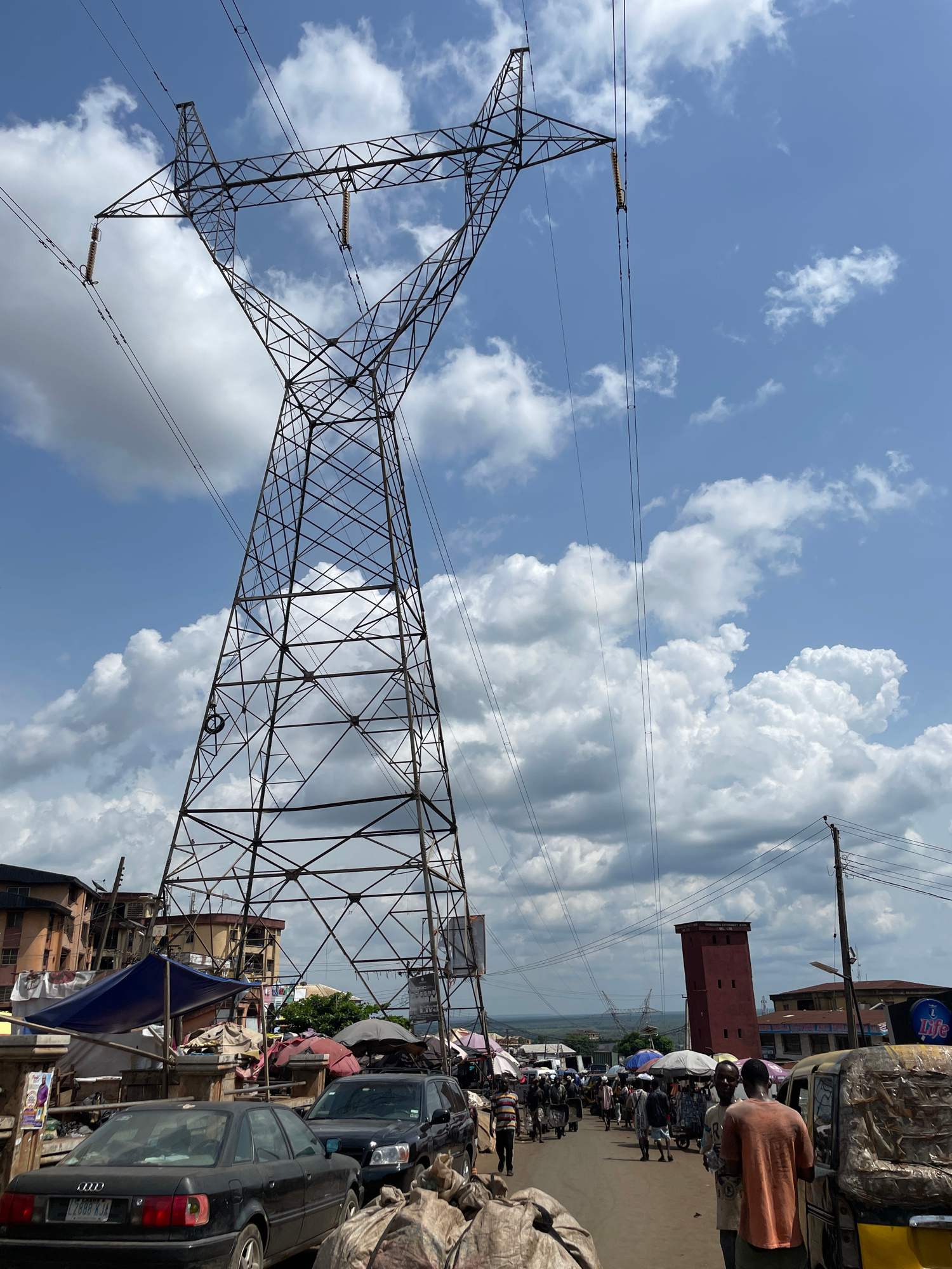 The image captures a vibrant street scene in Obosi, Nigeria, under a bright, cloudy sky. A massive metal lattice electricity pylon, extending from bottom to top, dominates the left side of the frame,…read more